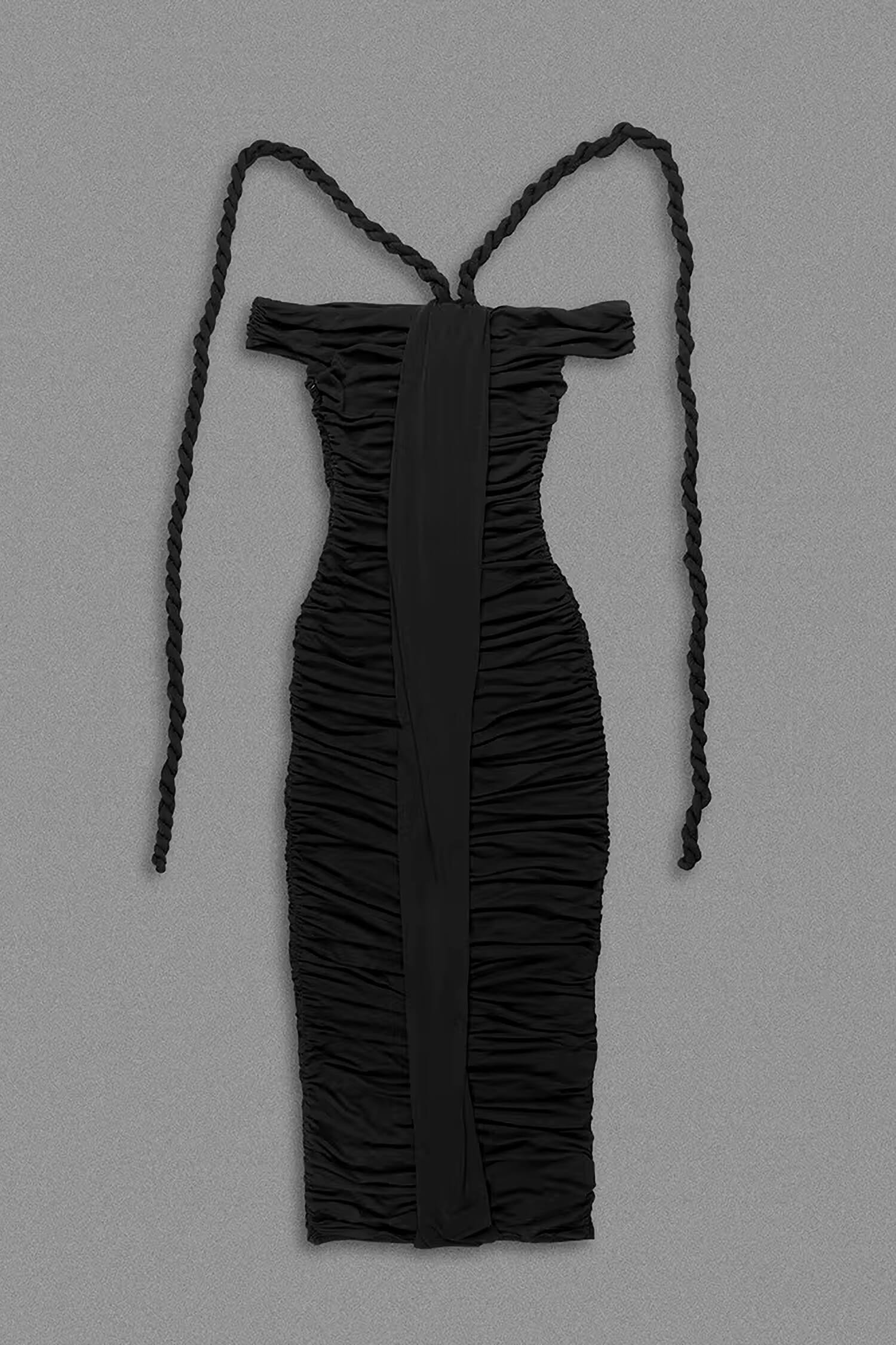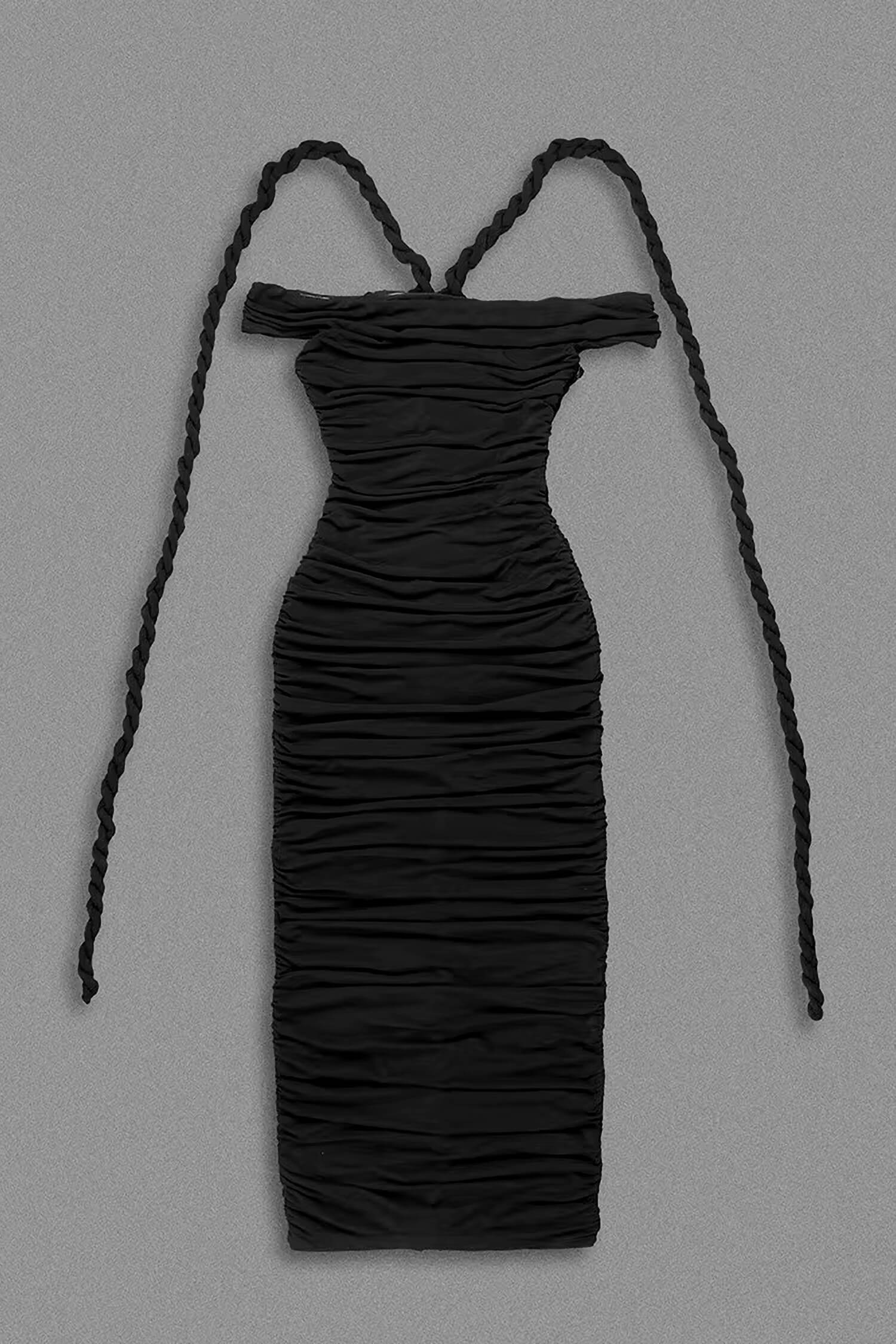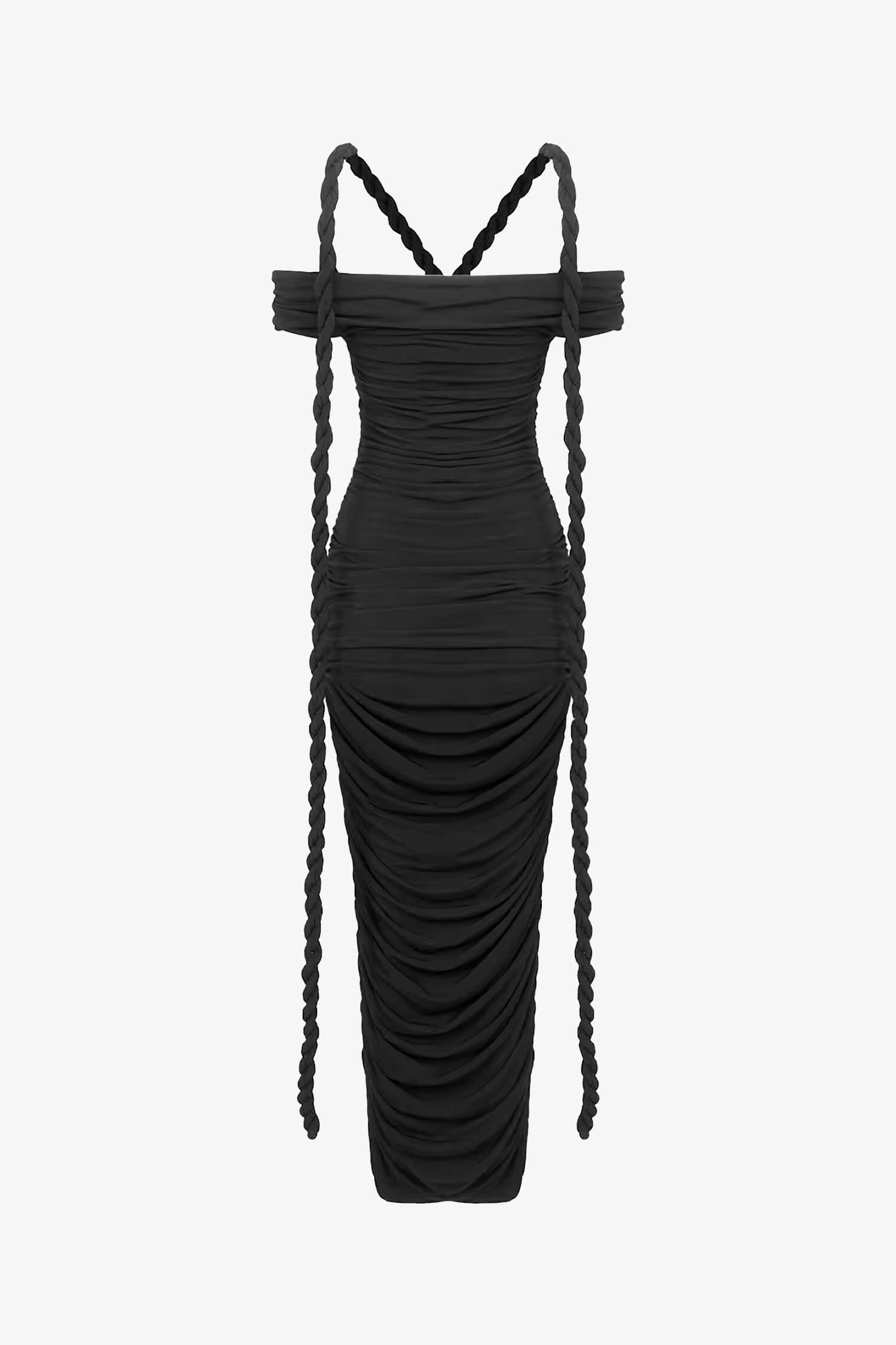 This White Off-The-Shoulder Ruched Maxi Dress is perfect for women looking for a chic yet comfortable look. The rope straps and off-the-shoulder style add a unique touch, making it ideal for weddings, evening, or date night. This maxi dress features a bodycon fit with bardot sleeves, ruched and draped details, and a backless design. Made from textured jersey, it's fully lined and has a stretchy fit with a secure zipper. This dress is suitable for various events like cocktail parties, club nights, and red carpet events, in all seasons—spring, summer, fall, or winter.
