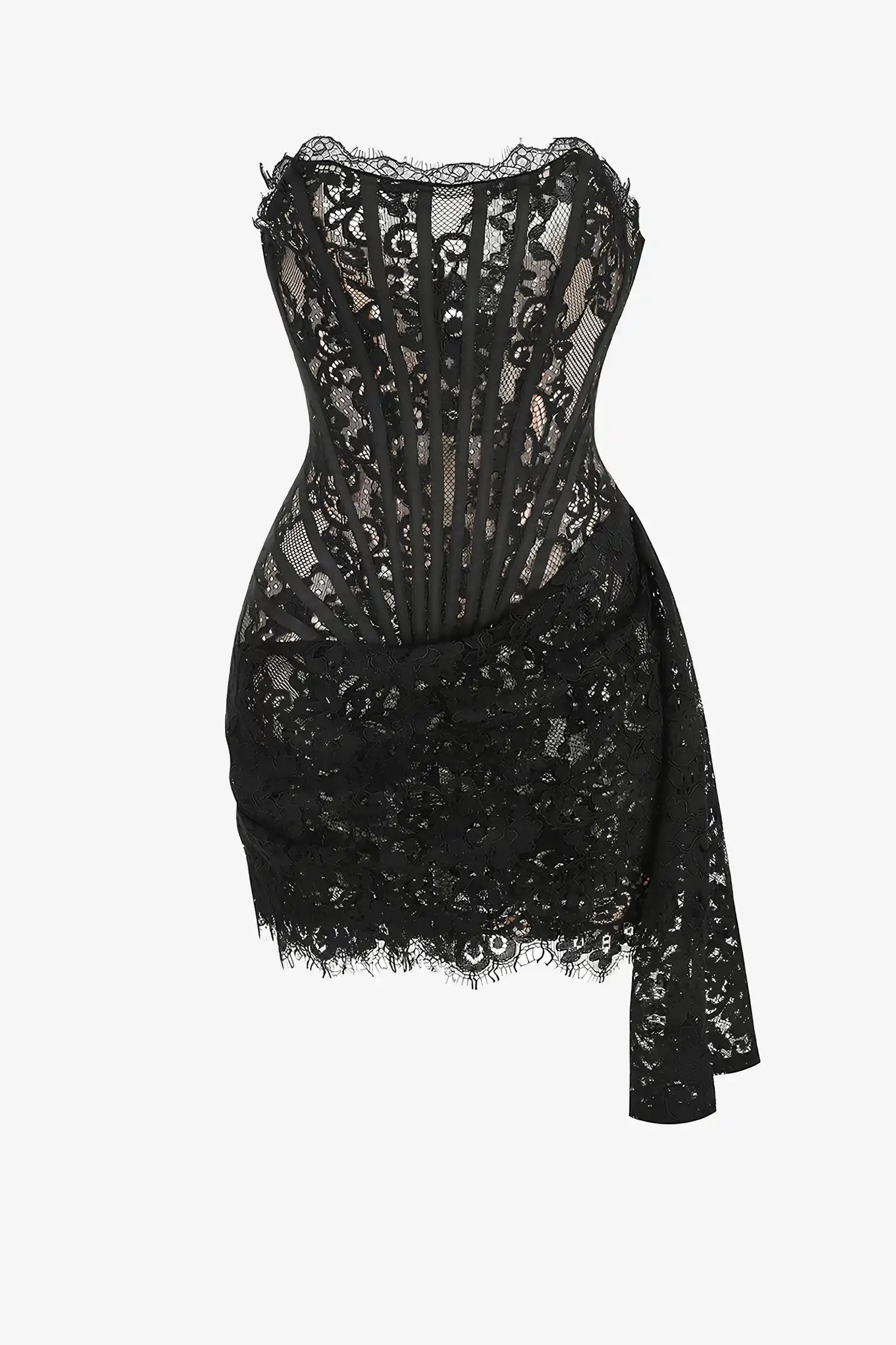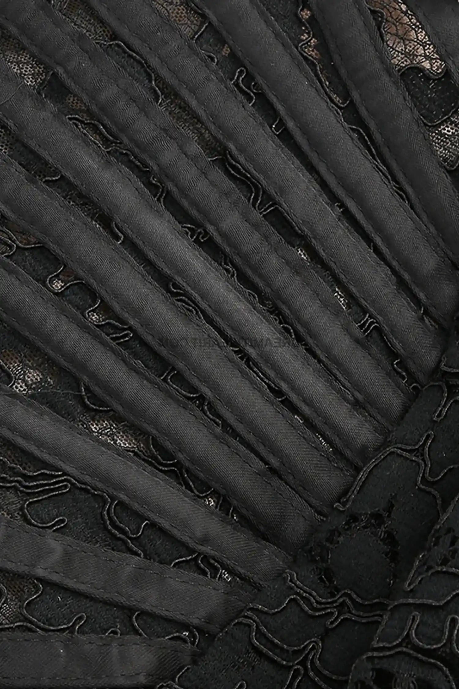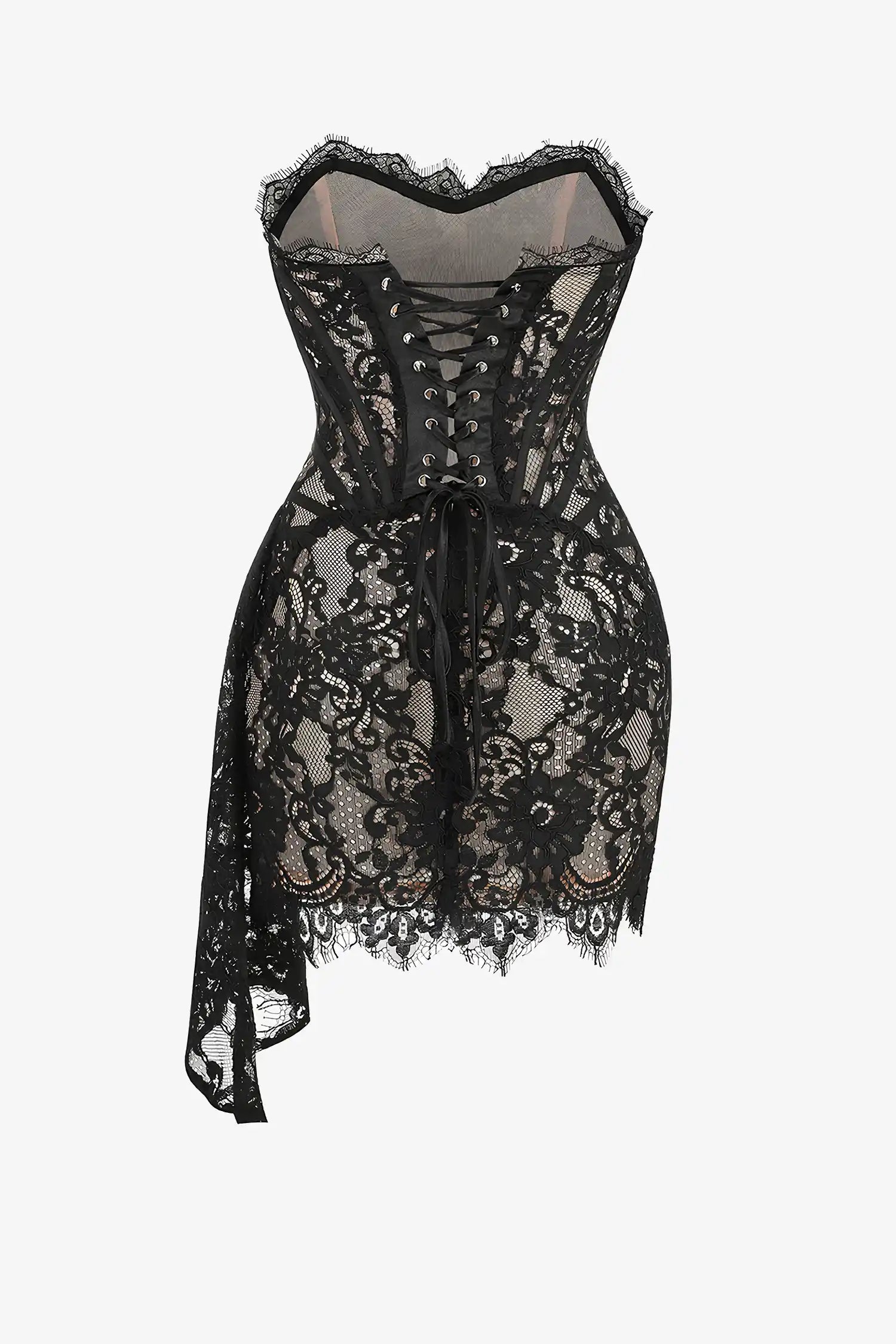 Close-up of black floral lace strapless corset dress with sheer mesh bodice and asymmetrical lace hem