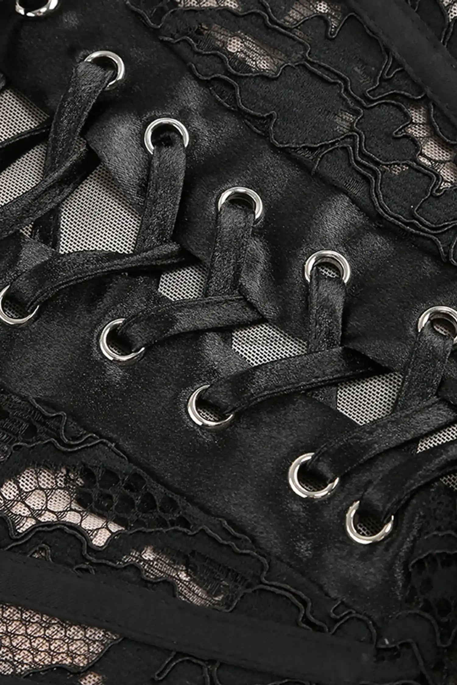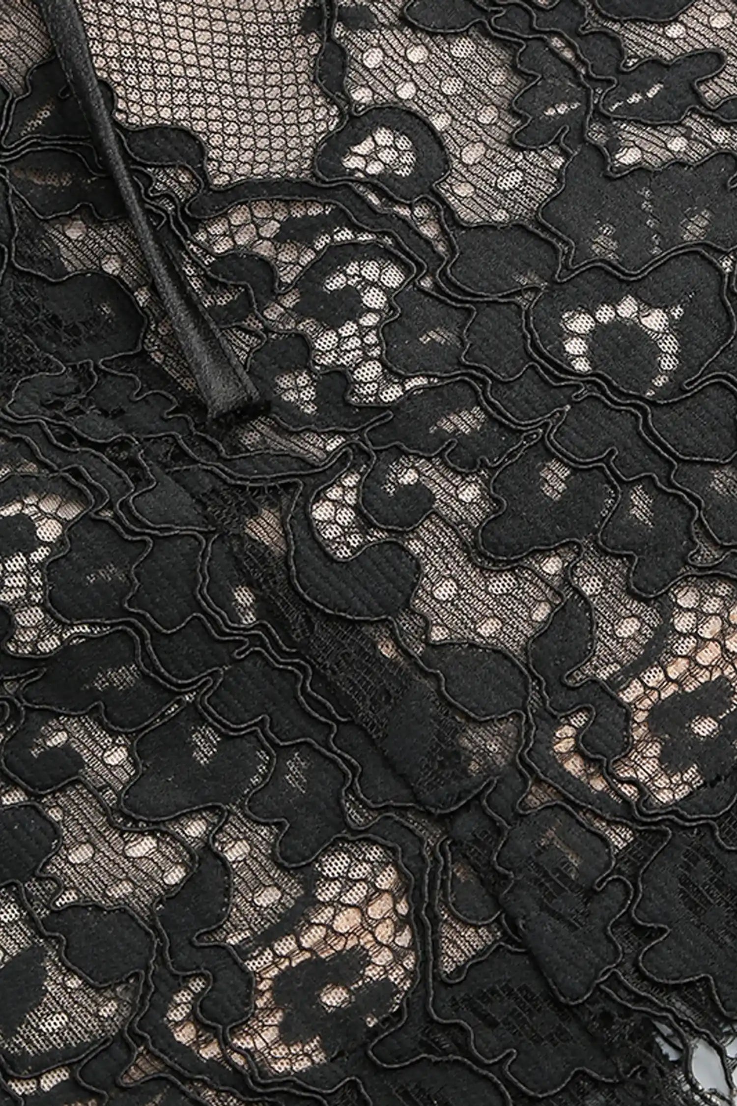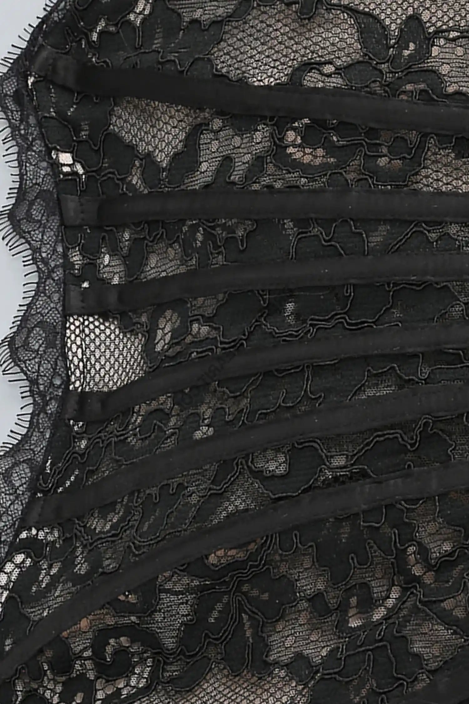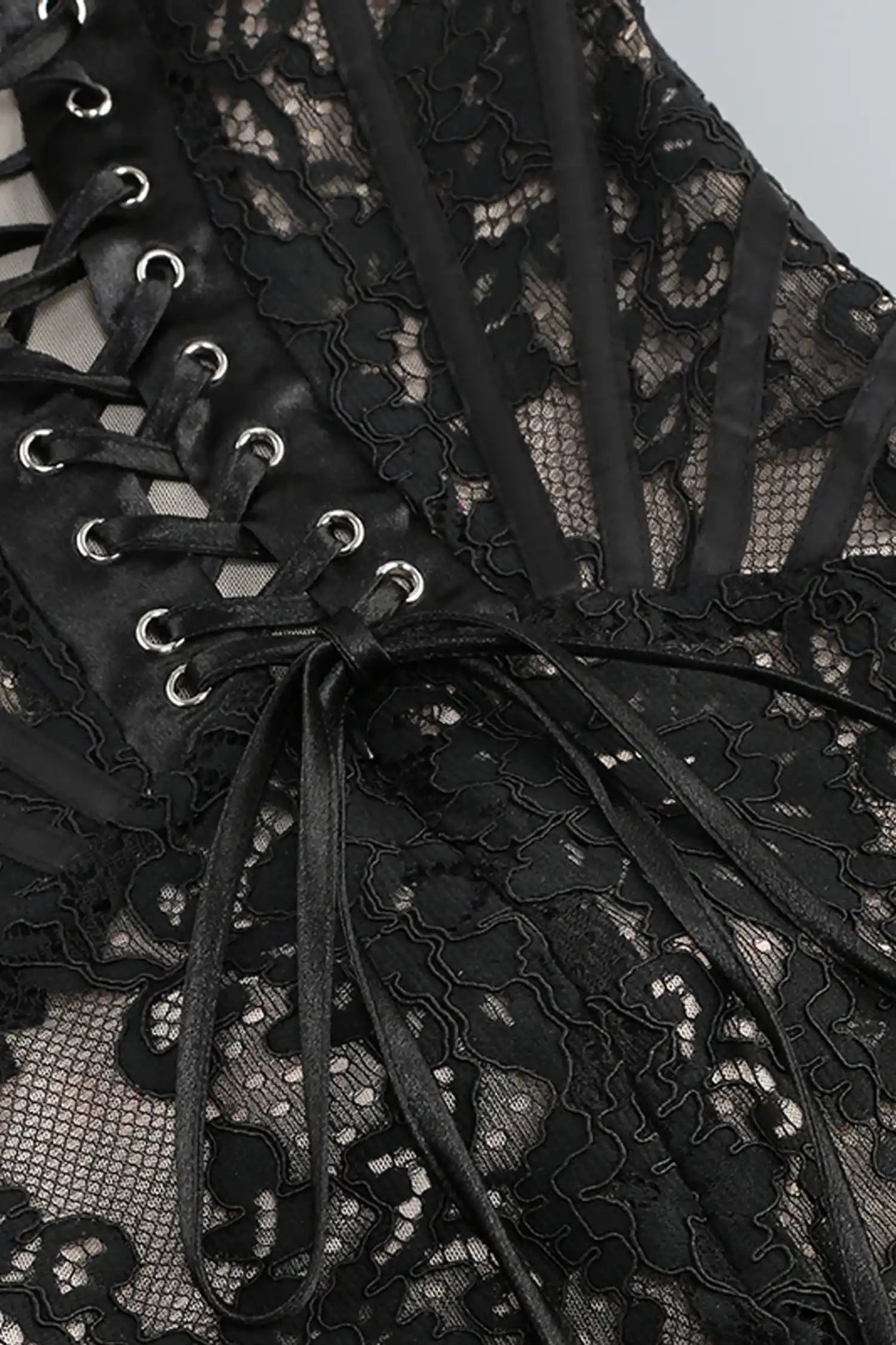 Close-up of black floral lace strapless corset dress with sheer mesh bodice and asymmetrical lace hem