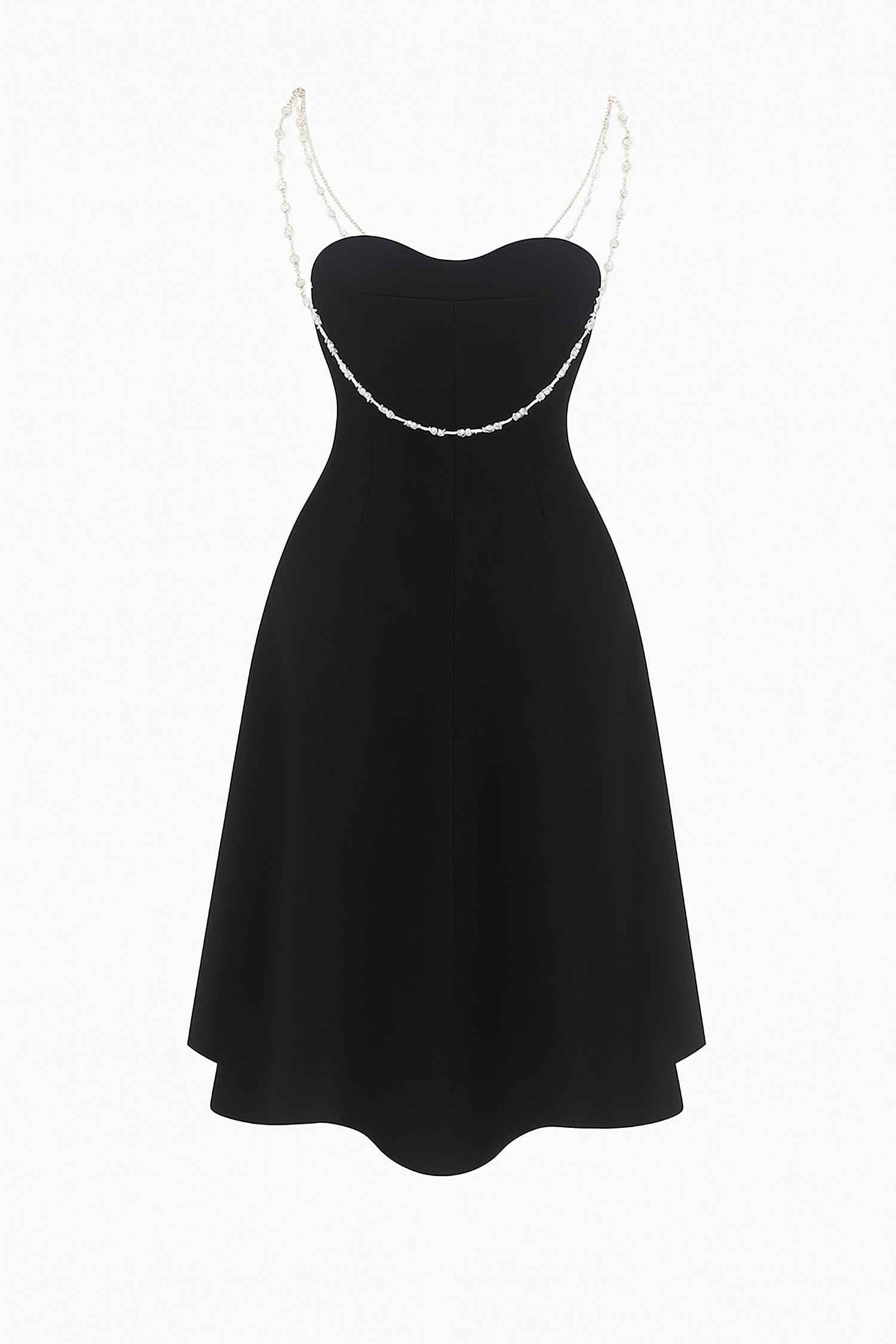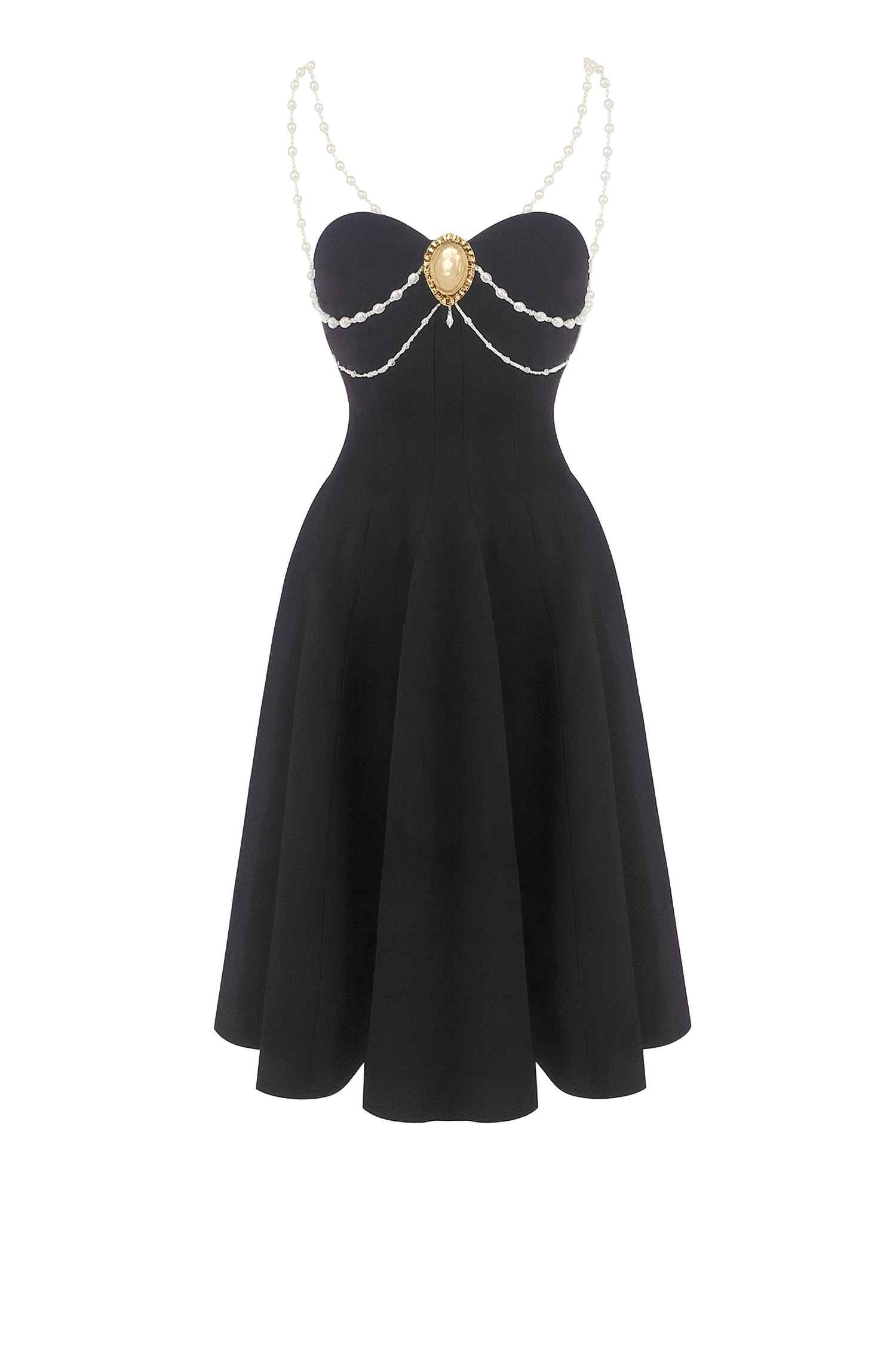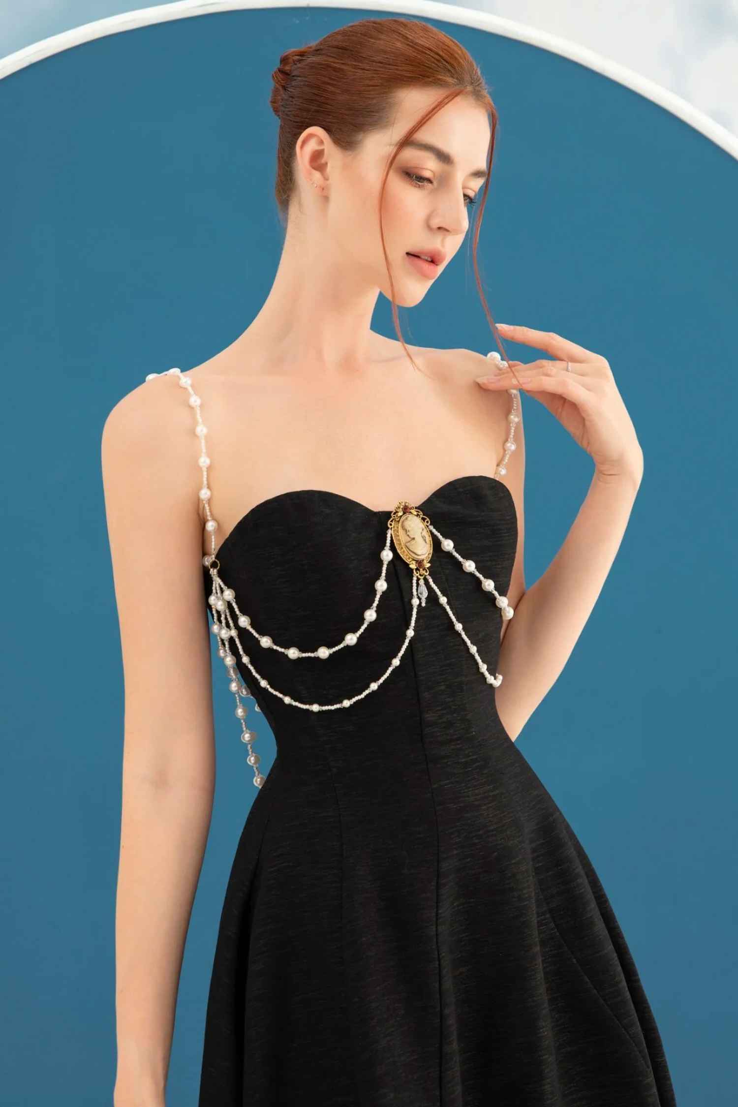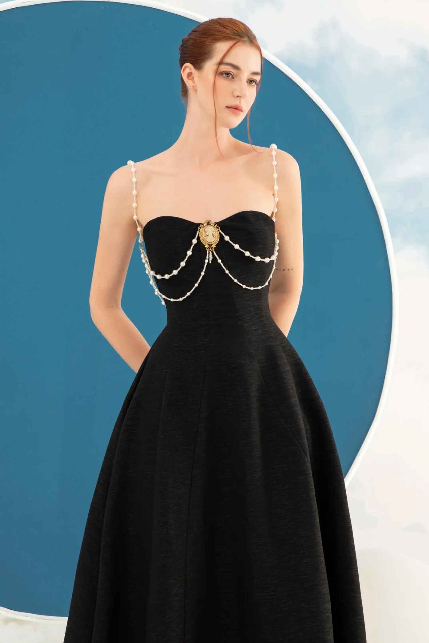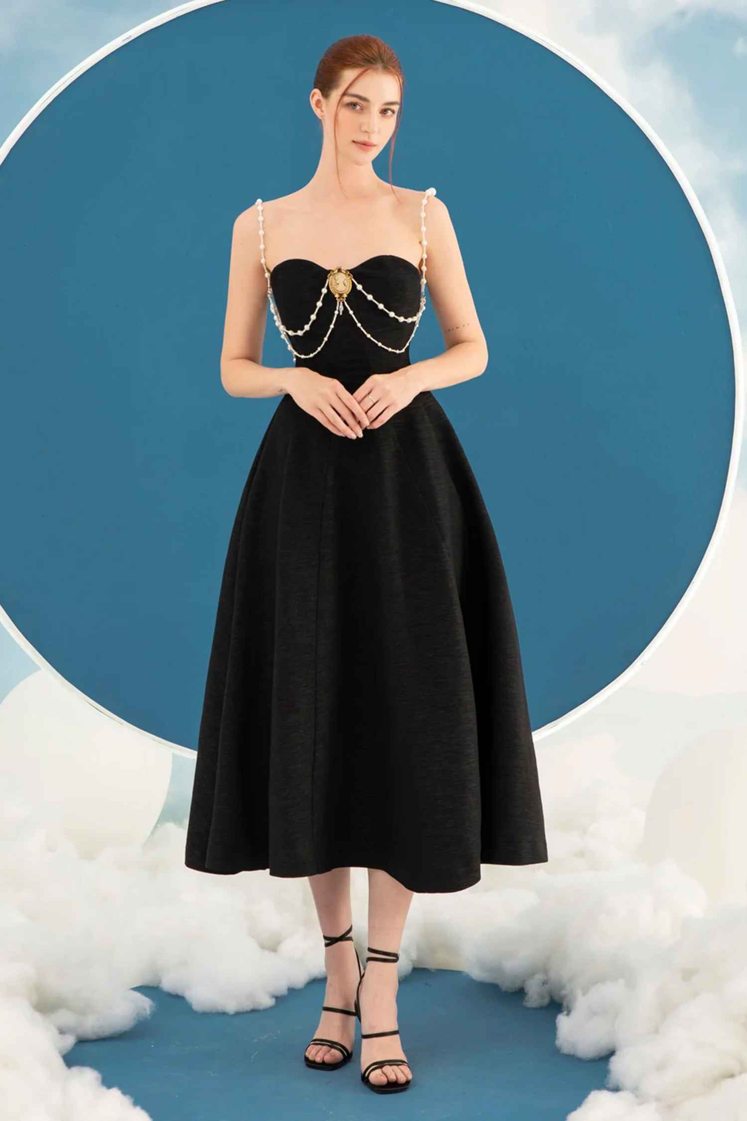 The Black Pearl Chain A-Line Midi Dress brings charm and class in one look. It comes with pearl chains around the shoulders and chest that give royal touch to the black base. The cameo detail in front makes it vintage and elegant, while the fit-and-flare cut shapes the body softly. Perfect for evening, cocktail, or dinner events. A timeless piece that looks rich and graceful for any night out.