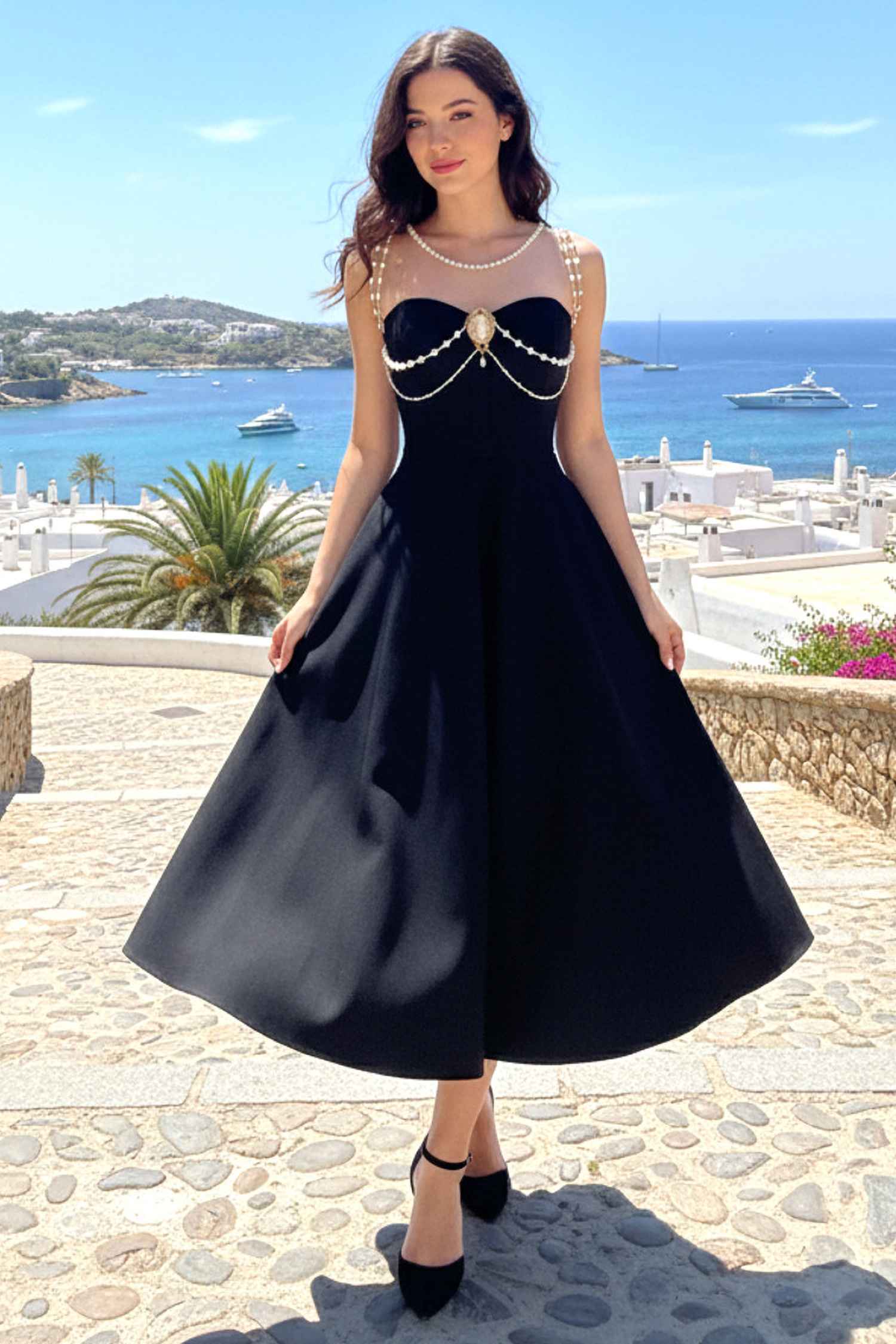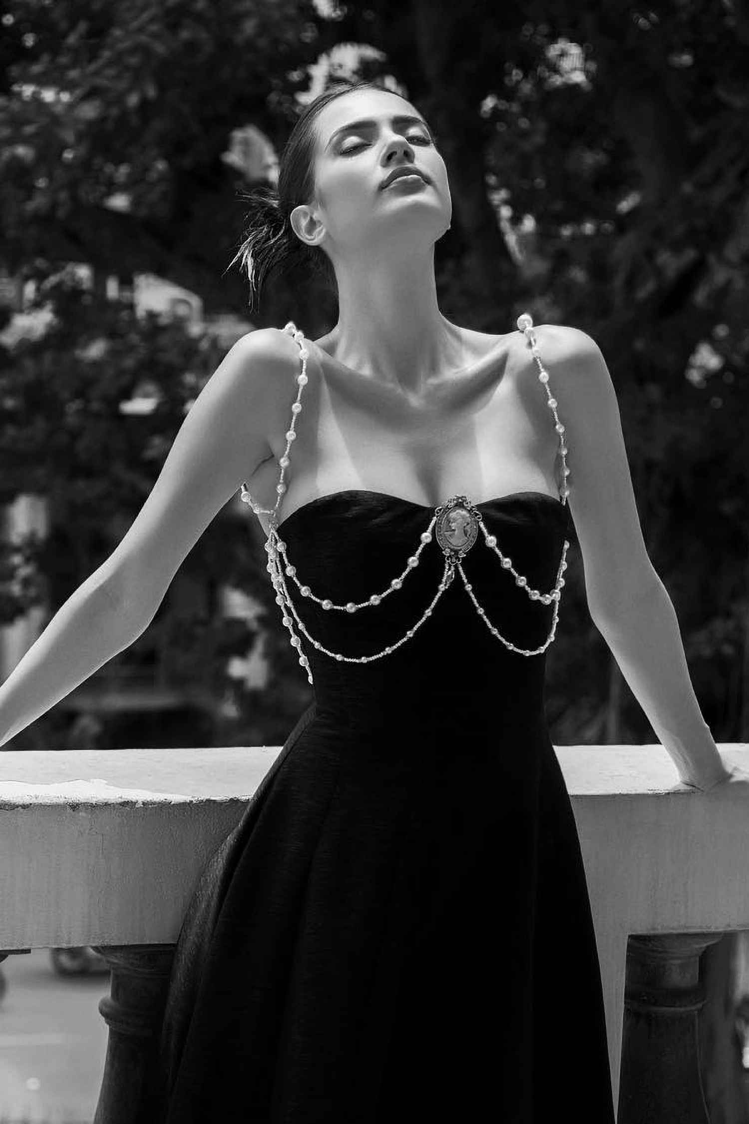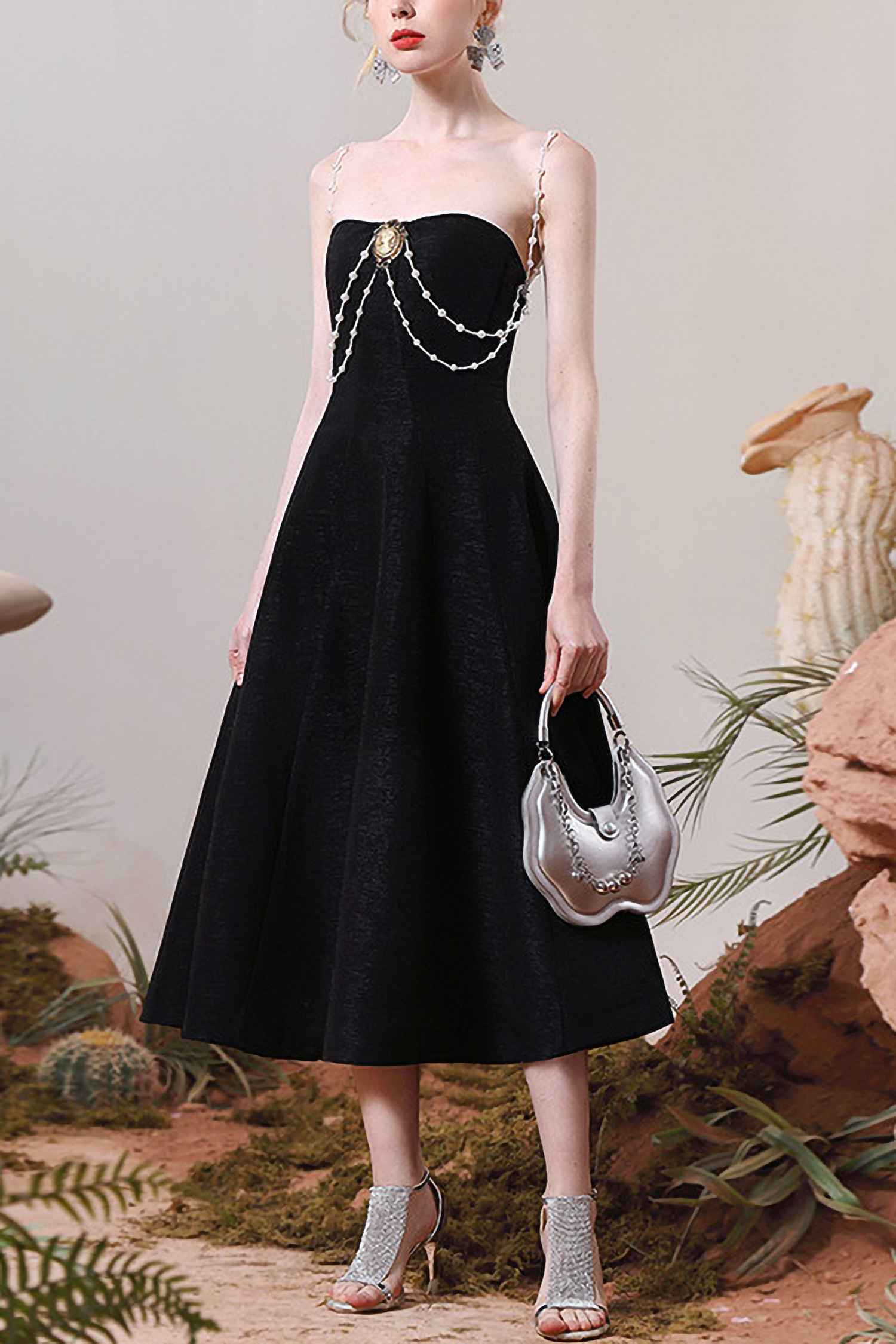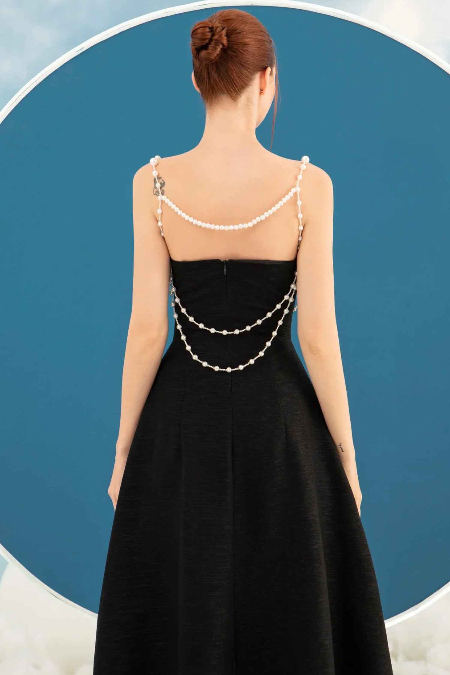 The Black Pearl Chain A-Line Midi Dress brings charm and class in one look. It comes with pearl chains around the shoulders and chest that give royal touch to the black base. The cameo detail in front makes it vintage and elegant, while the fit-and-flare cut shapes the body softly. Perfect for evening, cocktail, or dinner events. A timeless piece that looks rich and graceful for any night out.