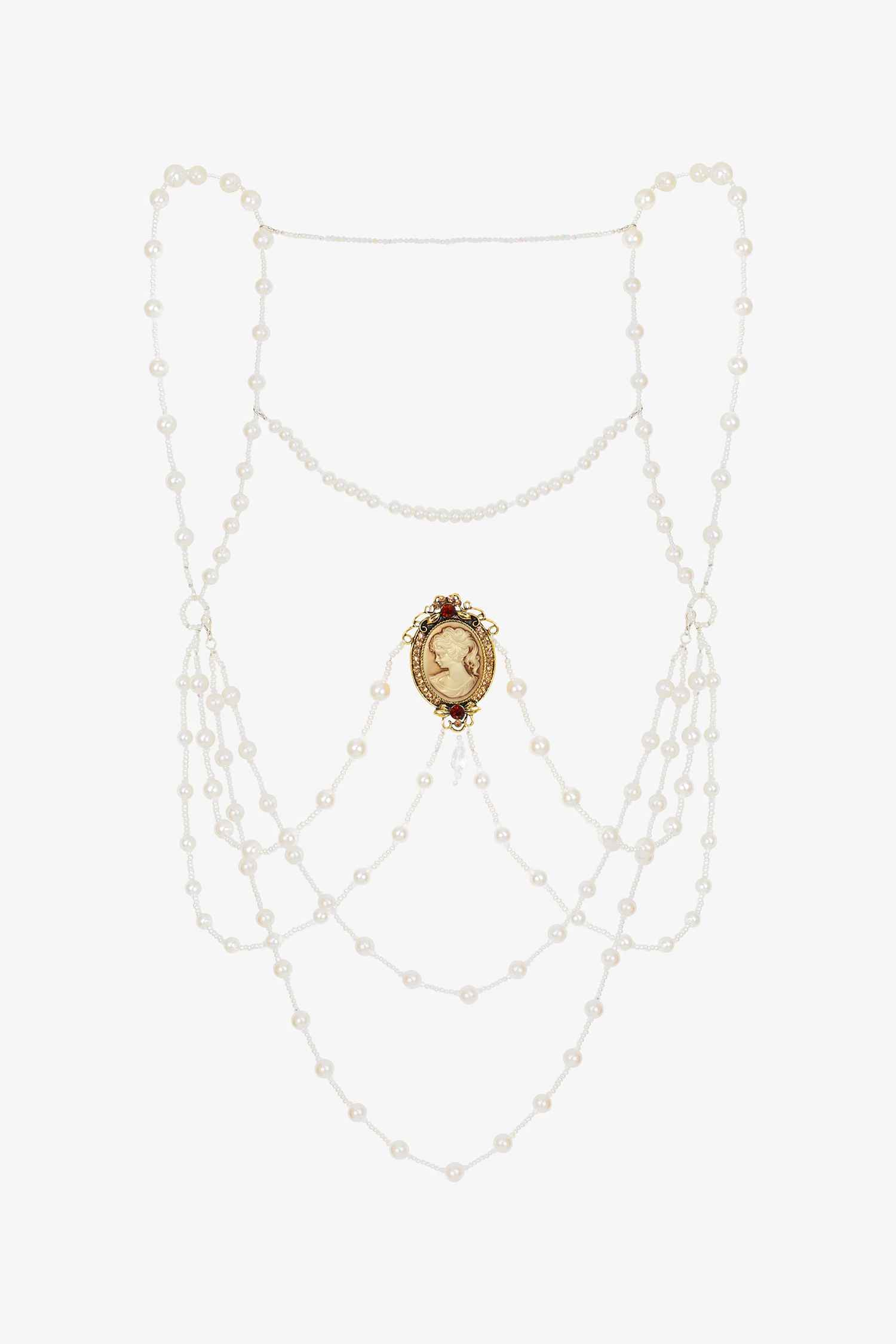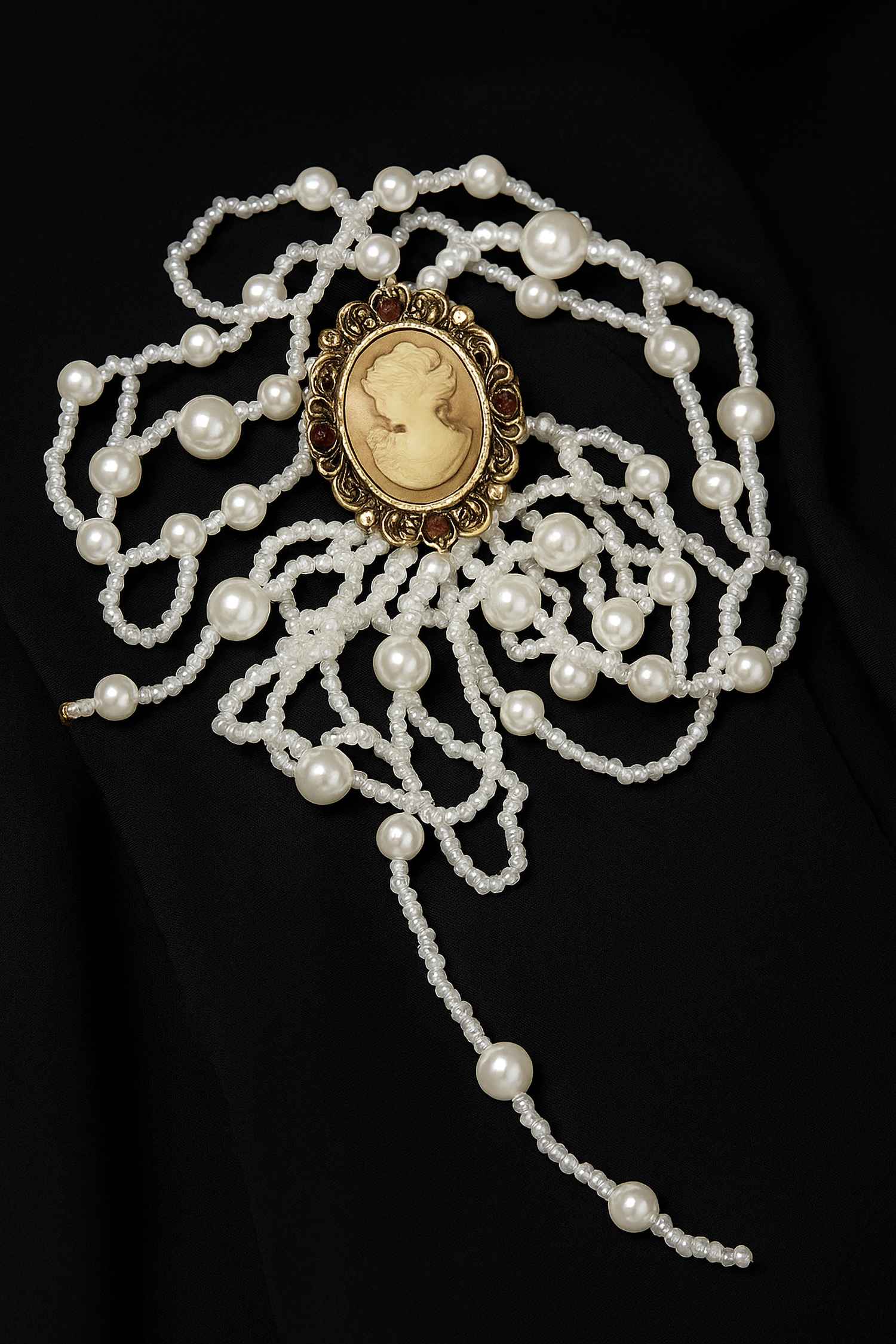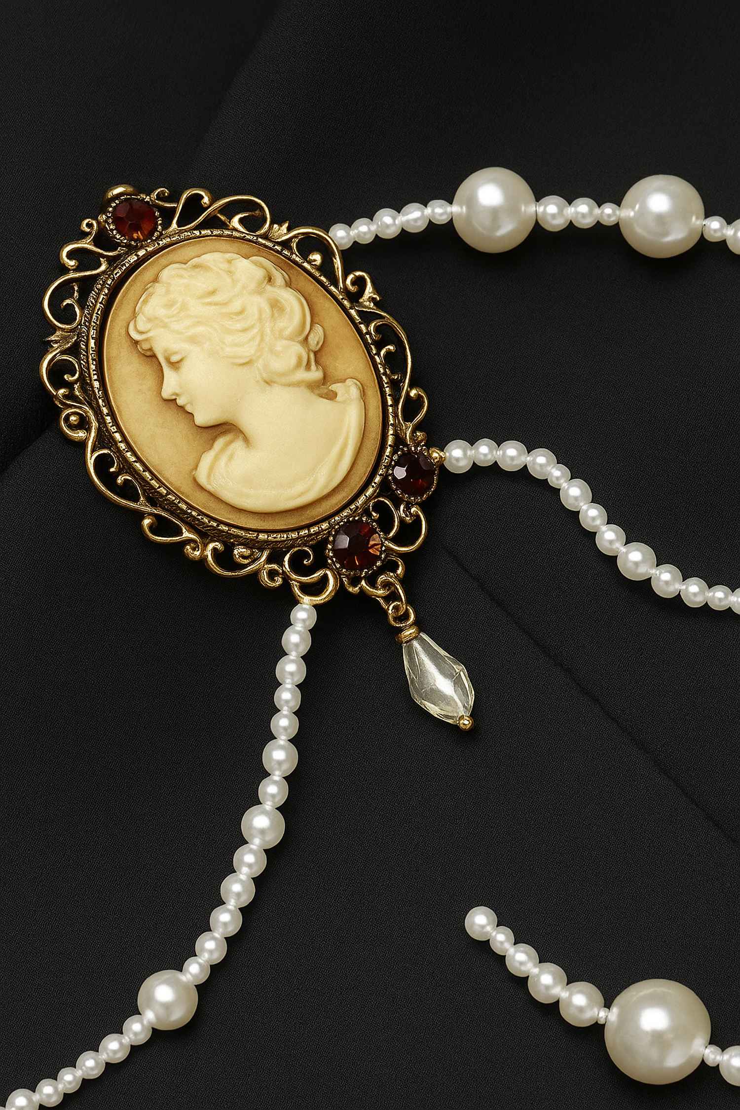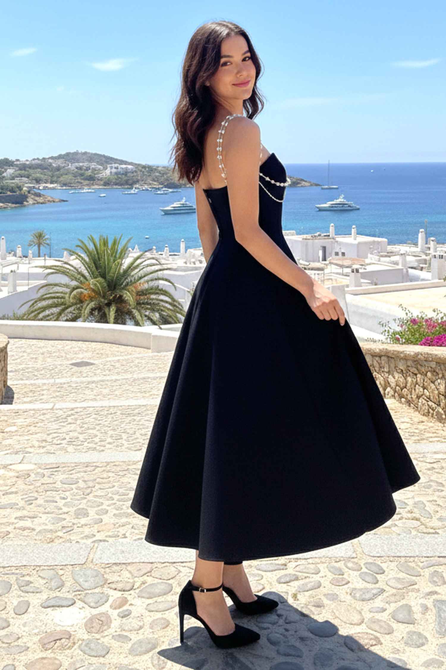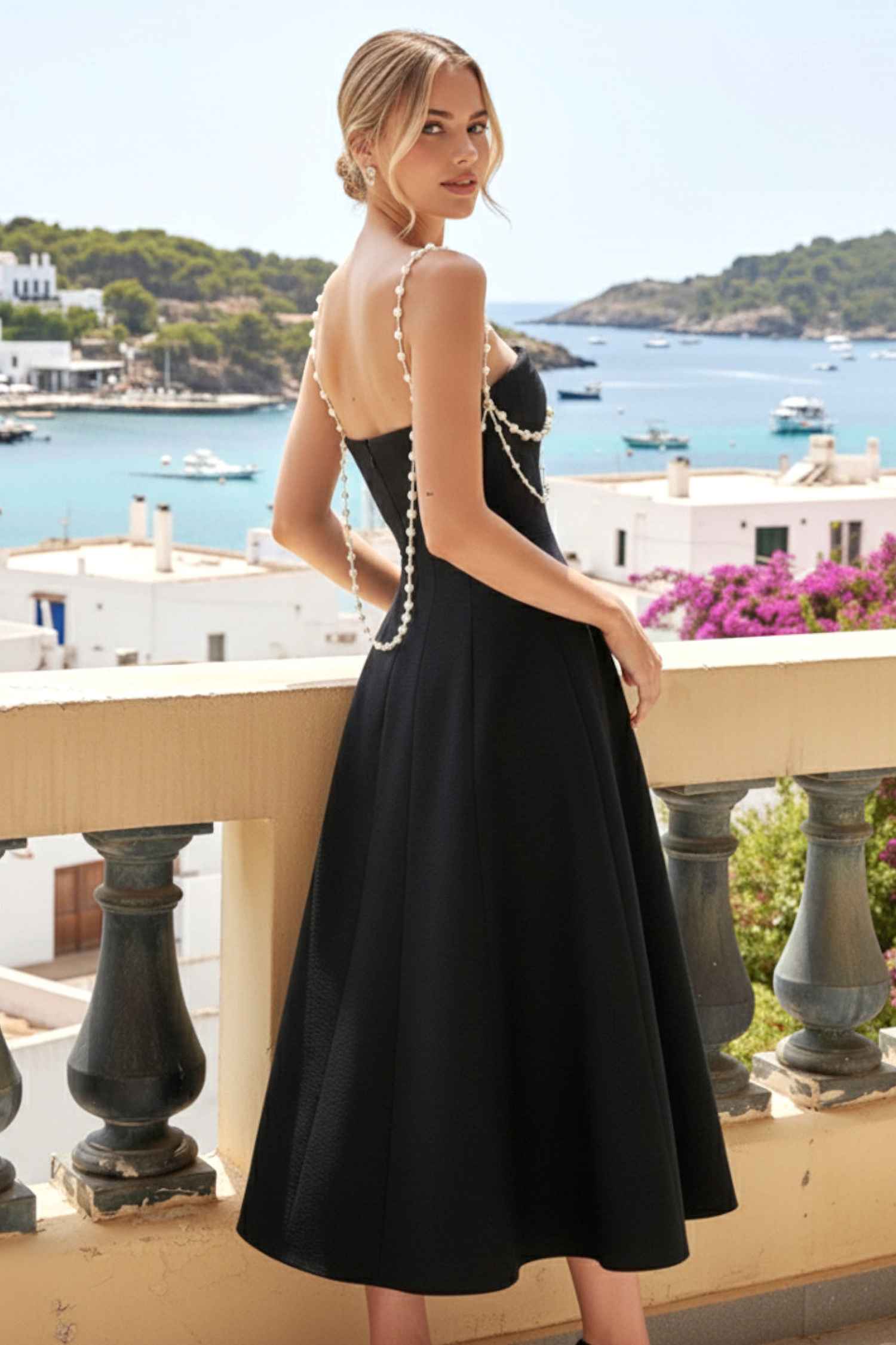 The Black Pearl Chain A-Line Midi Dress brings charm and class in one look. It comes with pearl chains around the shoulders and chest that give royal touch to the black base. The cameo detail in front makes it vintage and elegant, while the fit-and-flare cut shapes the body softly. Perfect for evening, cocktail, or dinner events. A timeless piece that looks rich and graceful for any night out.