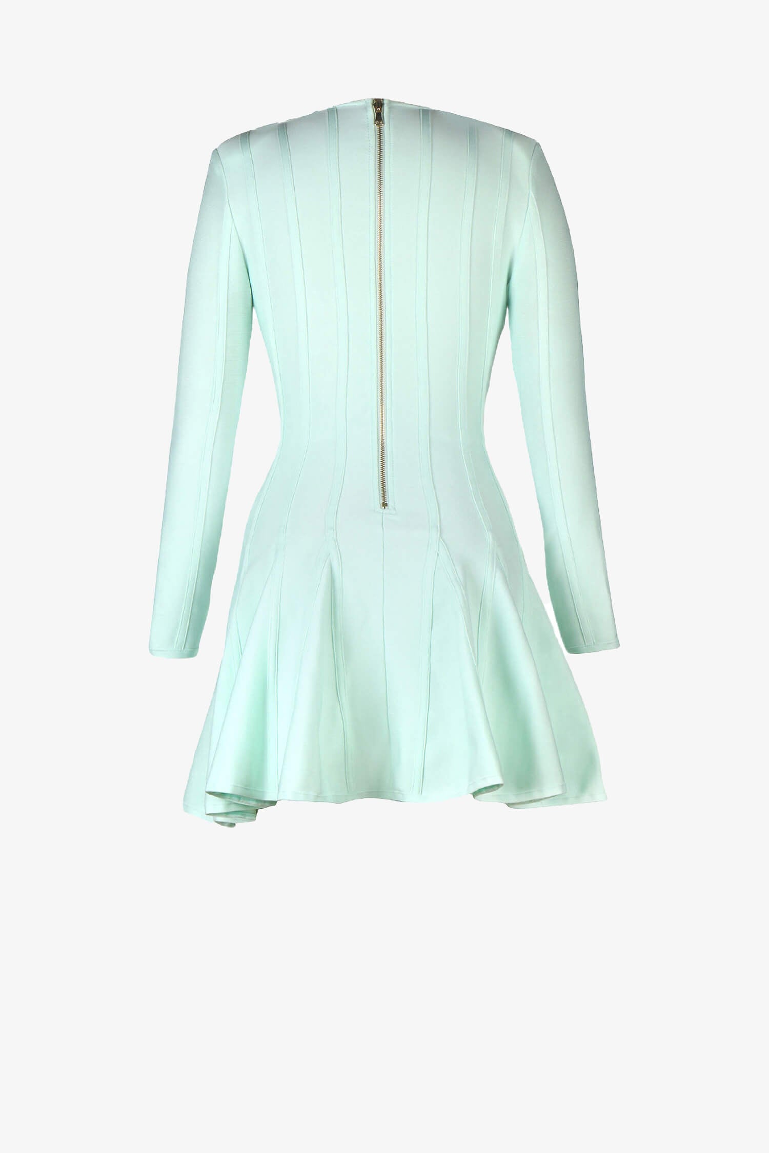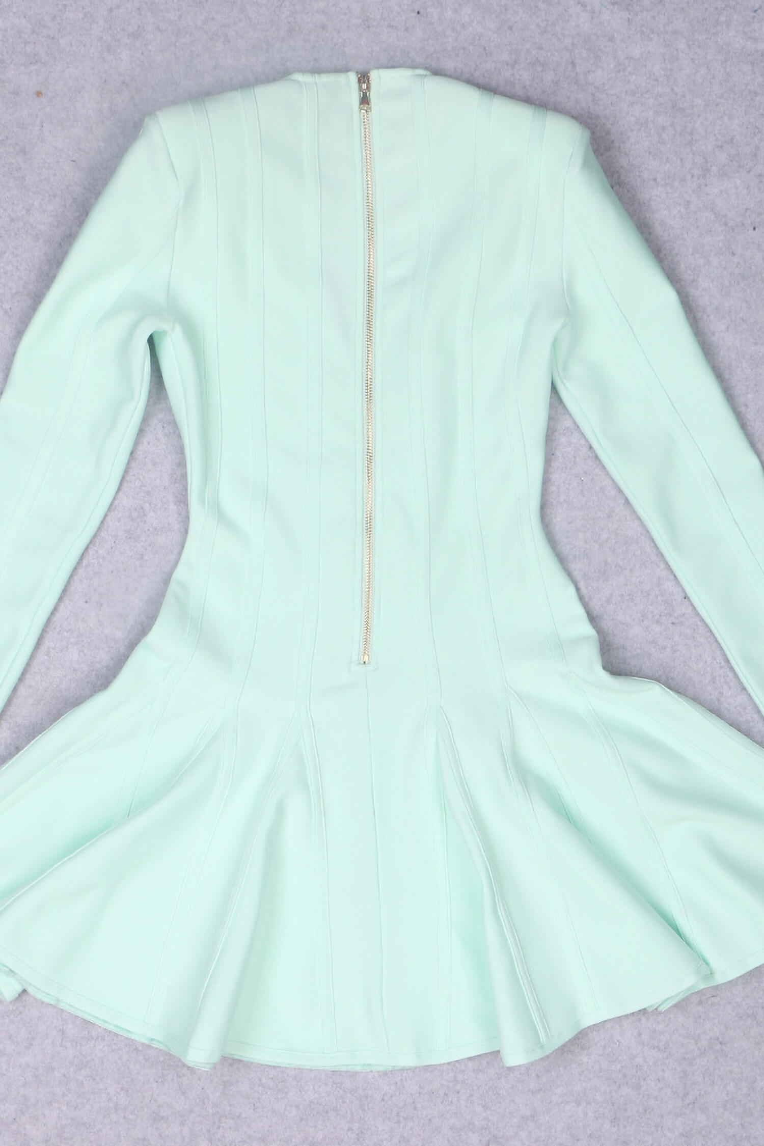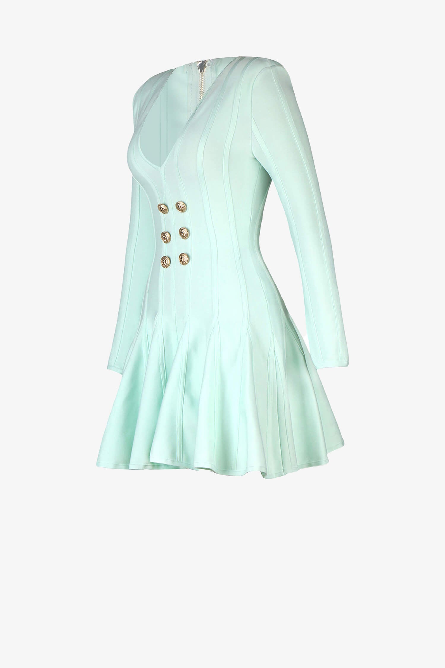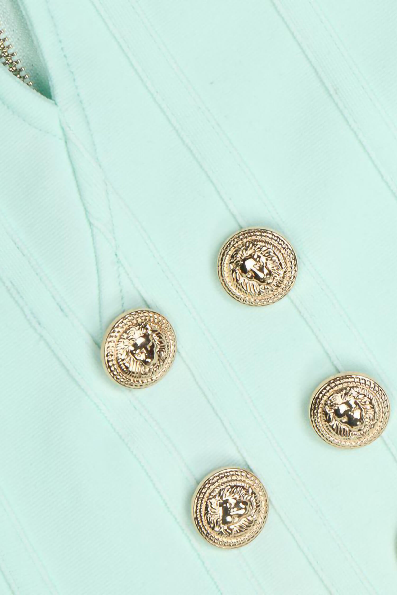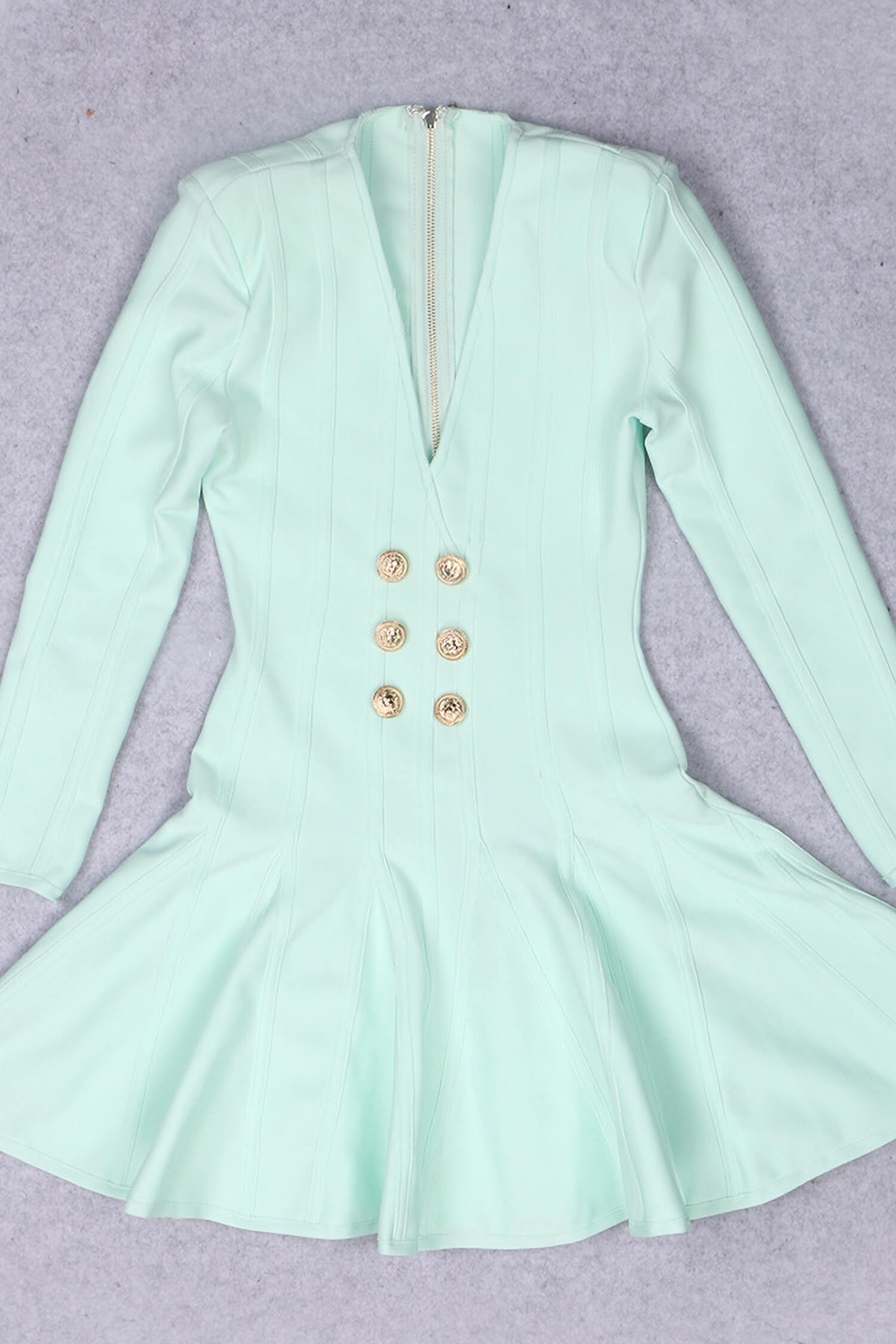 This Mint Green Long Sleeve Skater Dress is a beautiful pick for women who want style with a unique twist. Featuring a flattering v-neck and classic skater dress shape, it brings a playful yet elegant vibe perfect for any event. The dress includes chic gold embossed buttons for a touch of sophistication. Made from stretchy bandage fabric, this mini dress hugs comfortably, while its boned and ribbed design provides structure, giving a fitted look.