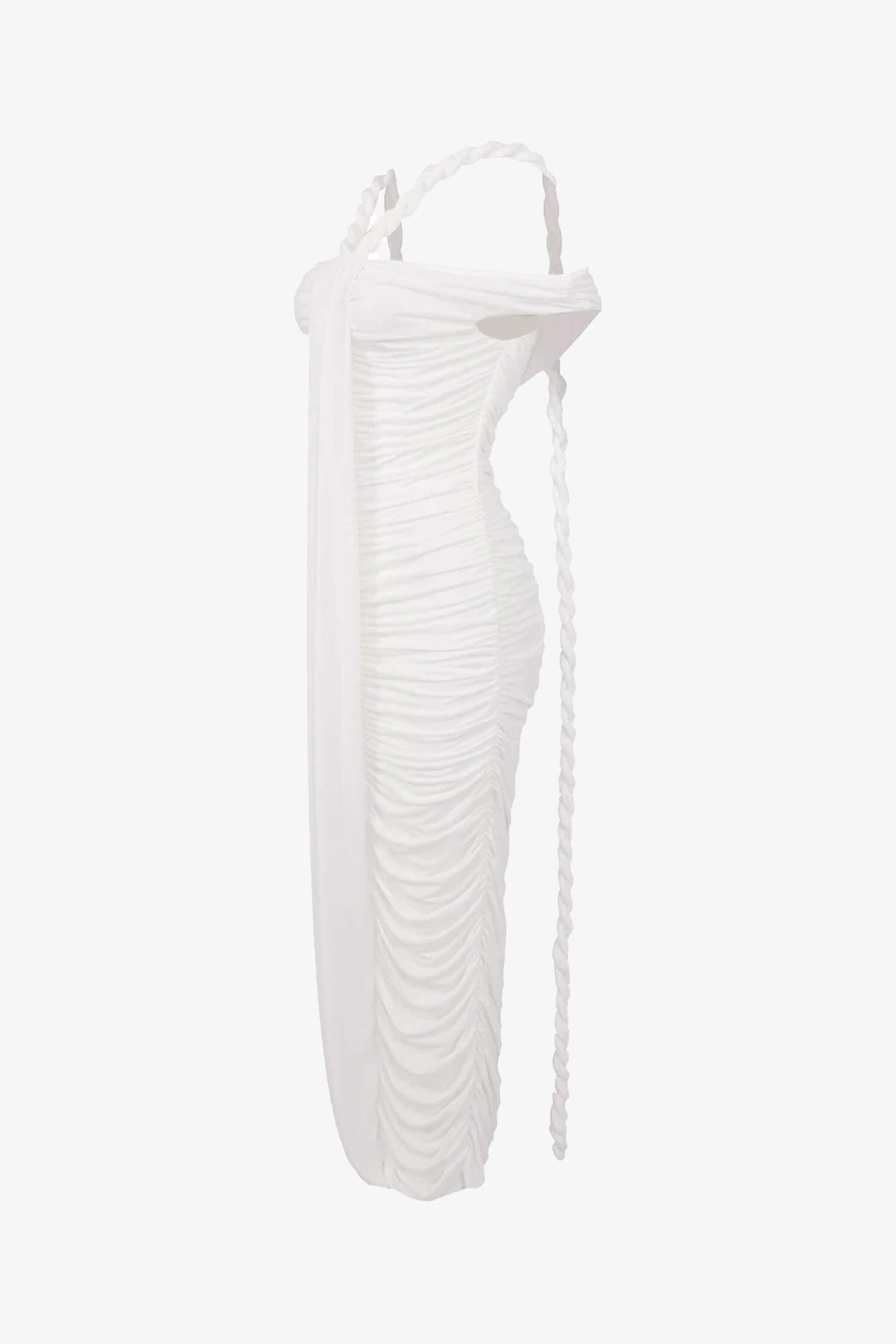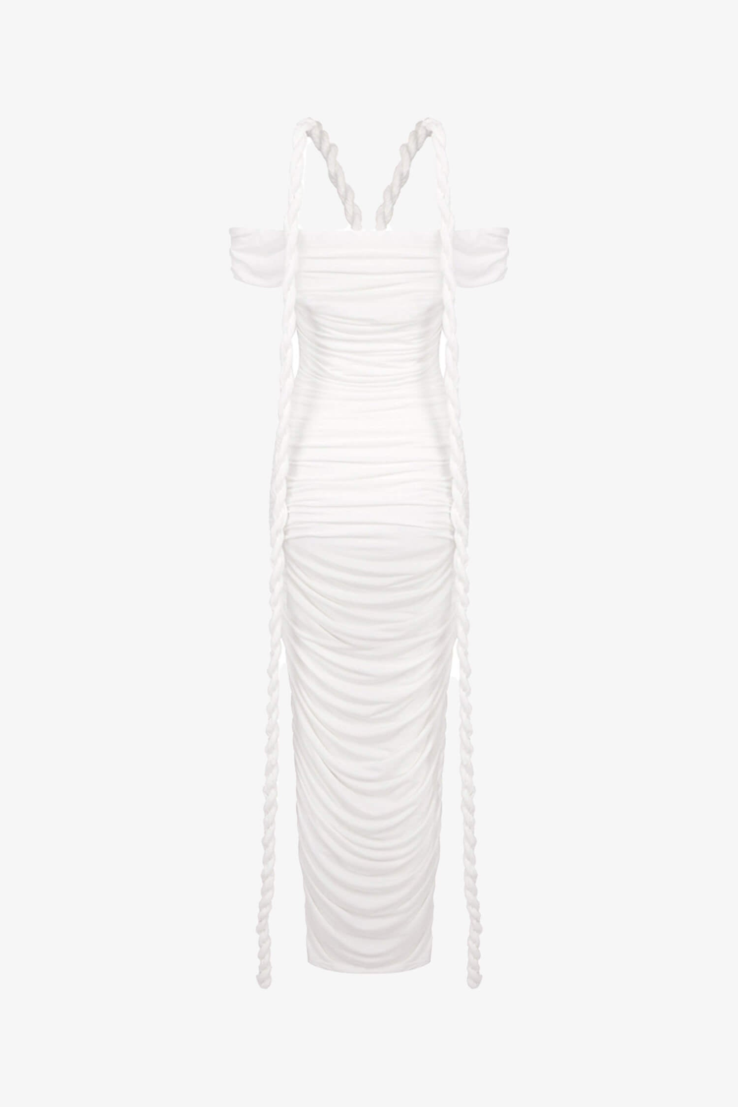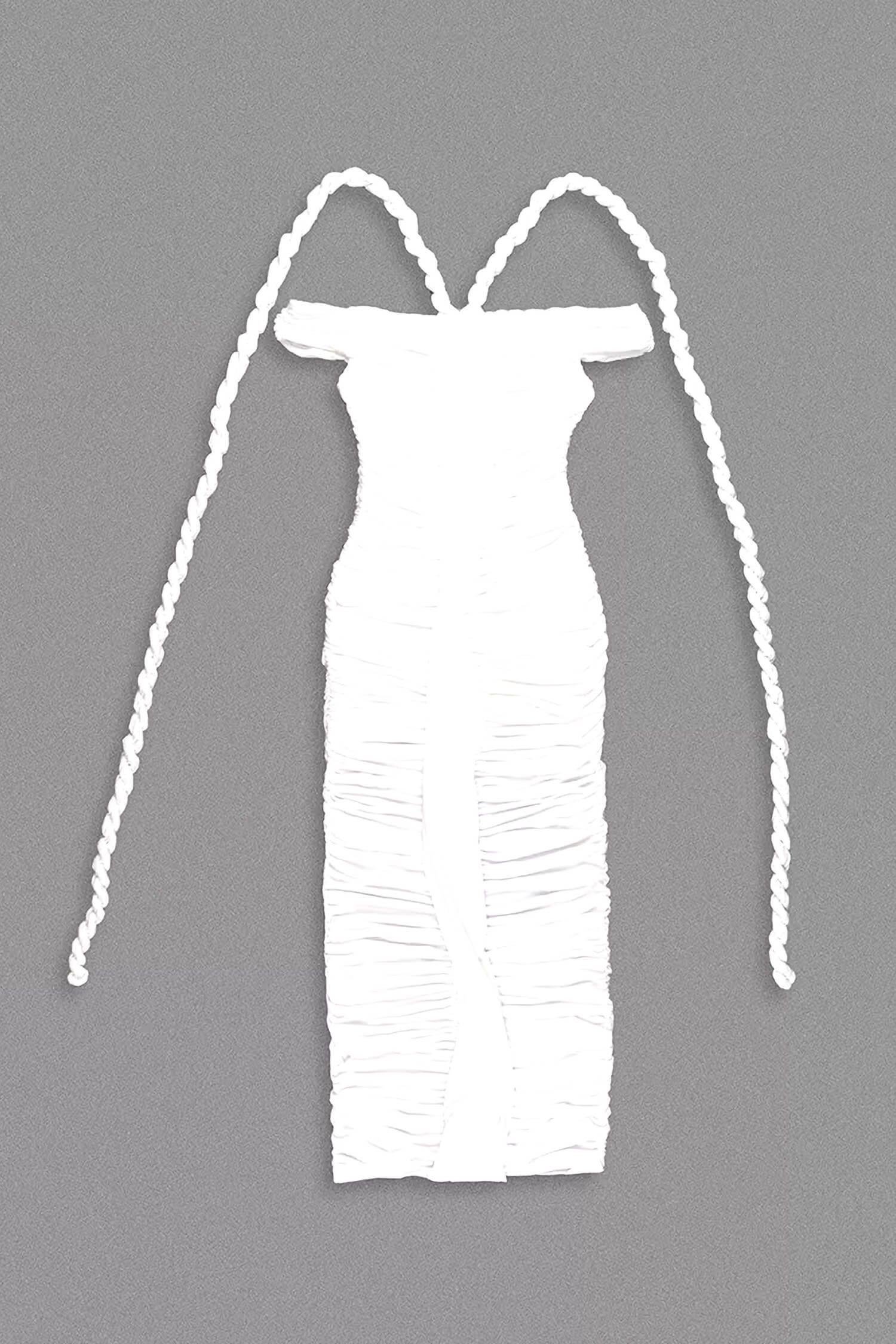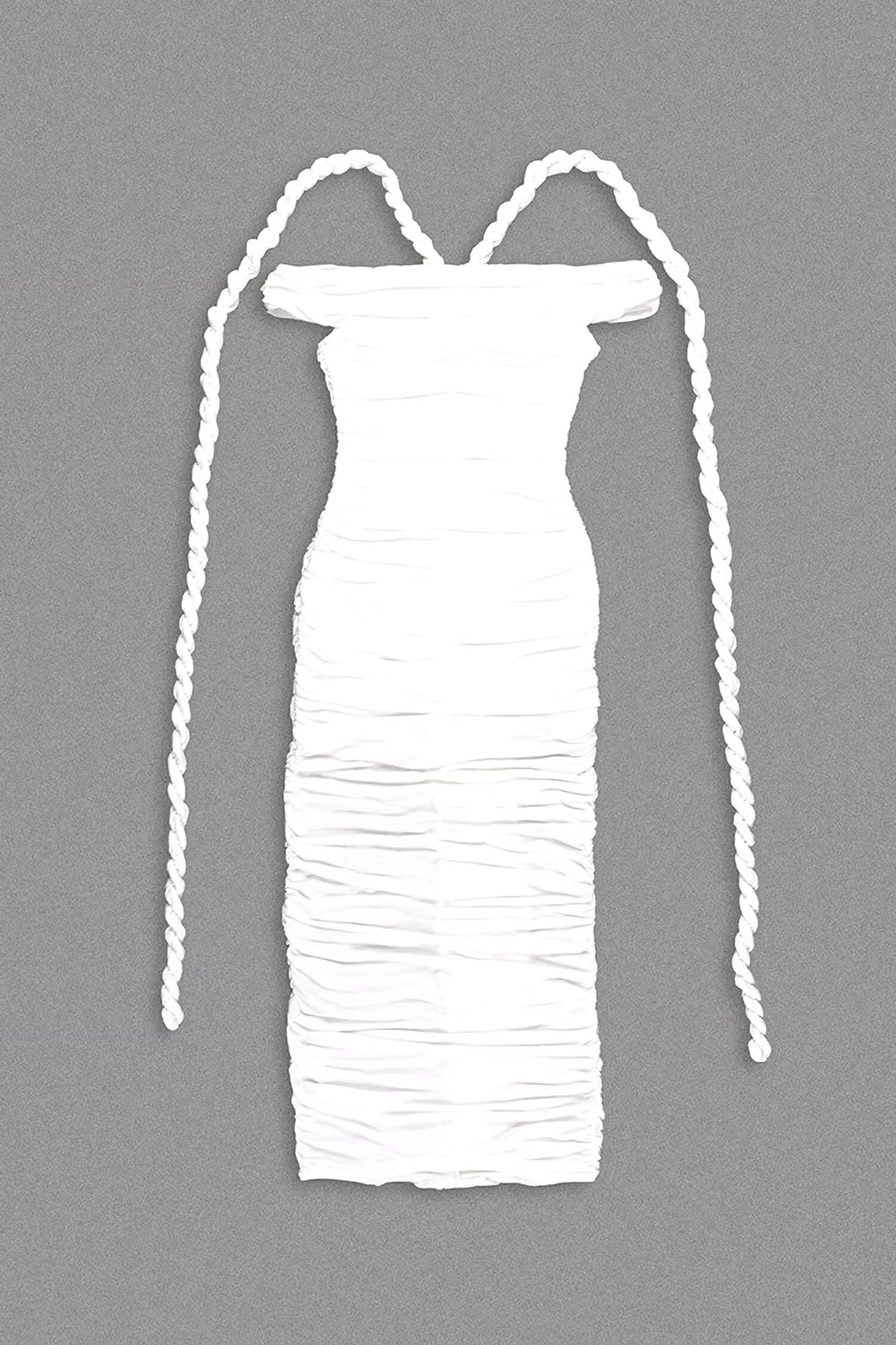 This White Off-The-Shoulder Ruched Maxi Dress is perfect for women looking for a chic yet comfortable look. The rope straps and off-the-shoulder style add a unique touch, making it ideal for weddings, evening, or date night. This maxi dress features a bodycon fit with bardot sleeves, ruched and draped details, and a backless design. Made from textured jersey, it's fully lined and has a stretchy fit with a secure zipper. This dress is suitable for various events like cocktail parties, club nights, and red carpet events, in all seasons—spring, summer, fall, or winter.