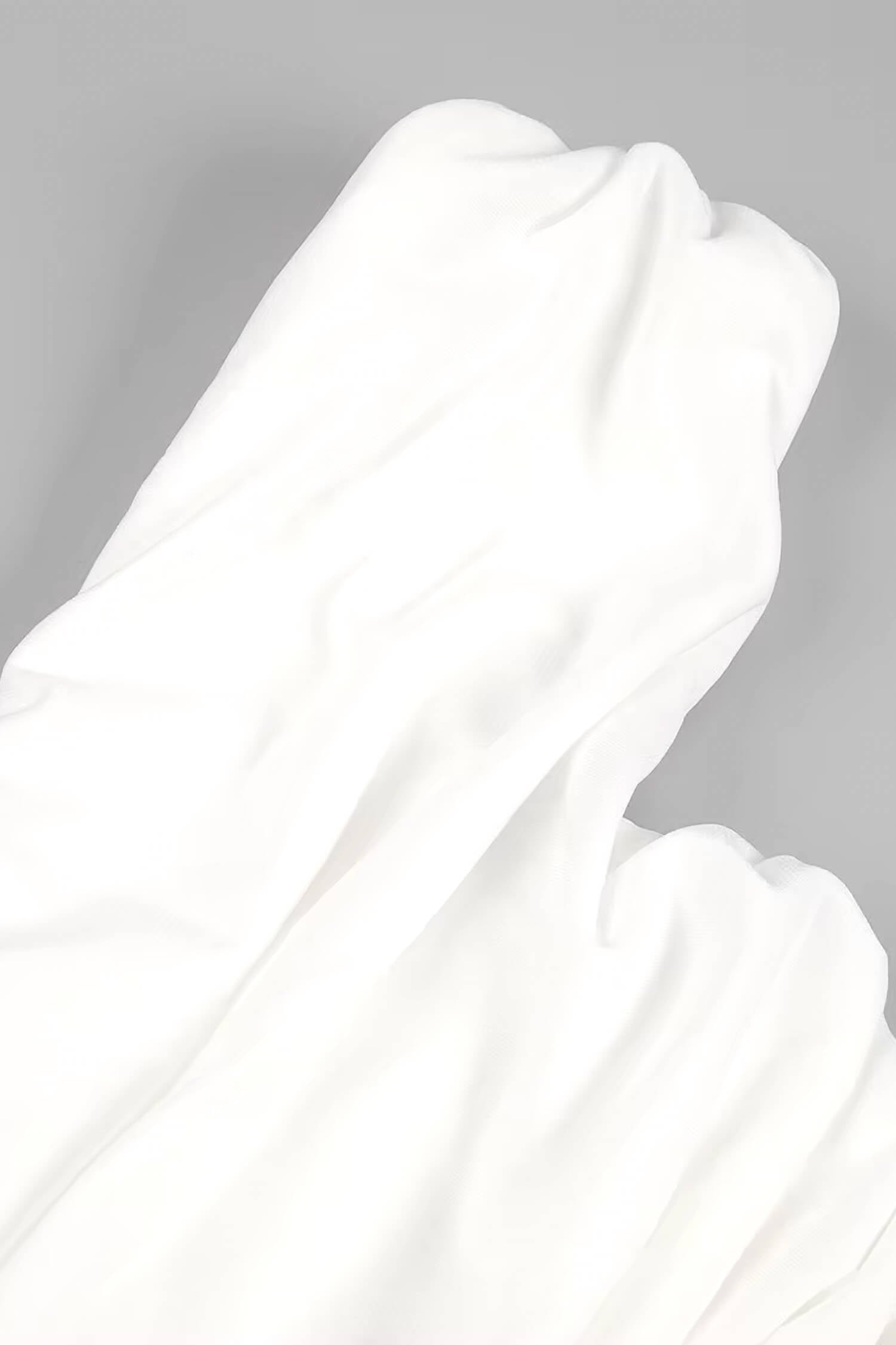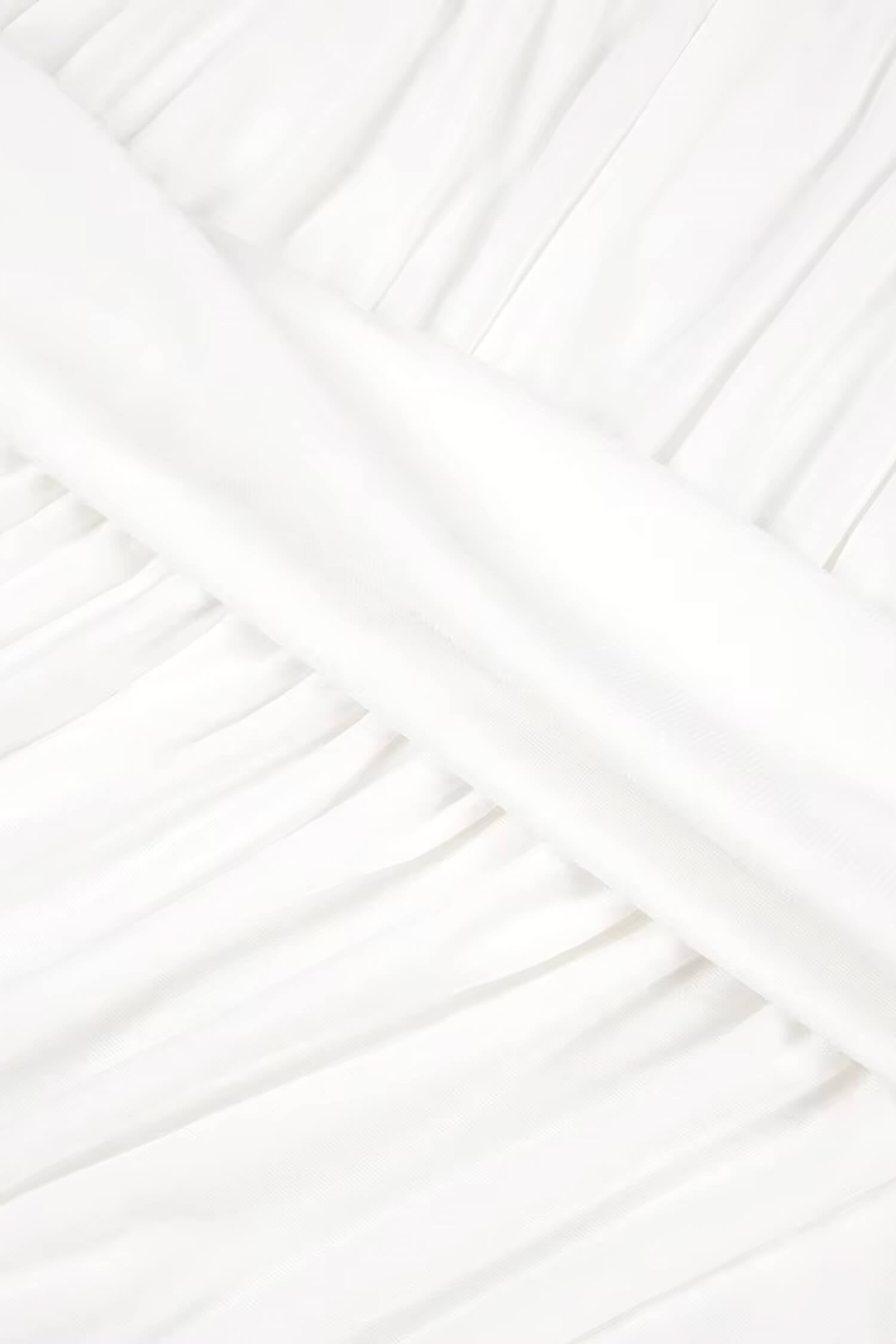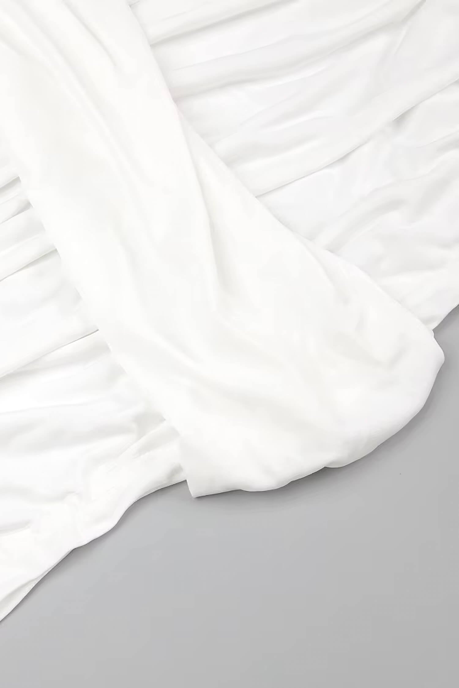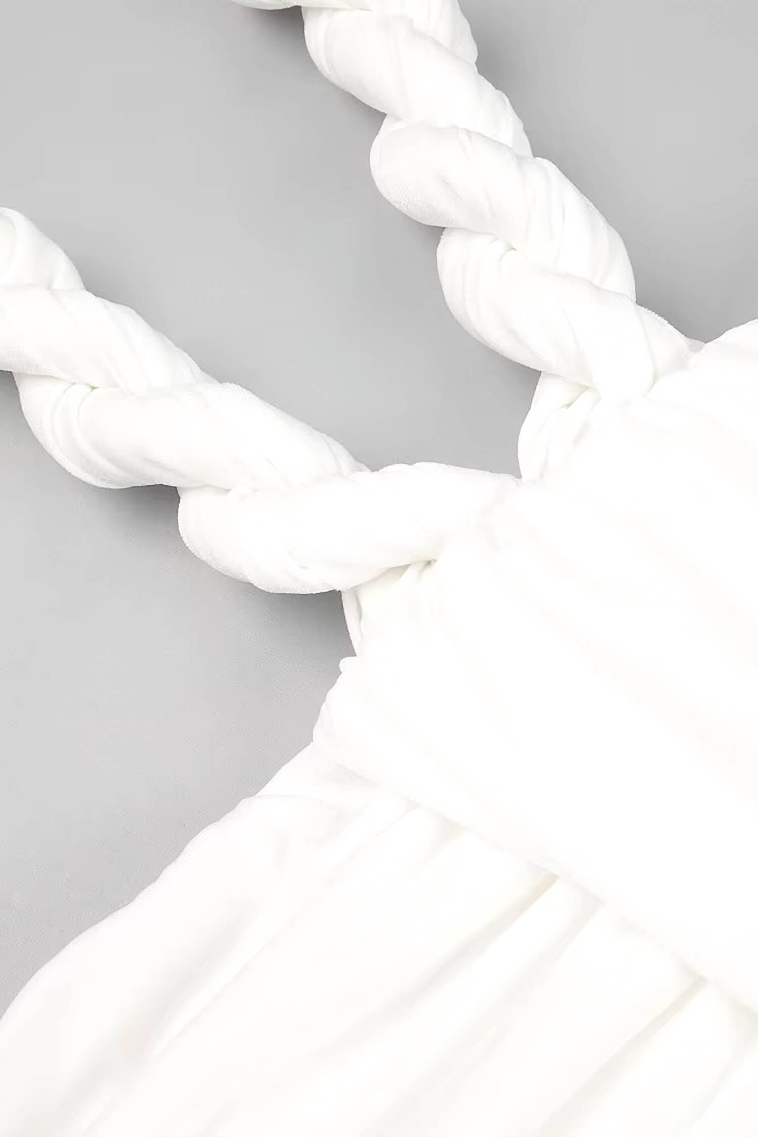 This White Off-The-Shoulder Ruched Maxi Dress is perfect for women looking for a chic yet comfortable look. The rope straps and off-the-shoulder style add a unique touch, making it ideal for weddings, evening, or date night. This maxi dress features a bodycon fit with bardot sleeves, ruched and draped details, and a backless design. Made from textured jersey, it's fully lined and has a stretchy fit with a secure zipper. This dress is suitable for various events like cocktail parties, club nights, and red carpet events, in all seasons—spring, summer, fall, or winter.