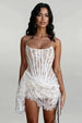 Turn heads in this white lace mini dress, built with a structured corset bodice and sheer layered lace that hugs the figure just right. It’s strapless, short, and shaped with an asymmetrical hem that shows off your legs. Adjustable ties at the back help with the perfect fit. A soft satin lining keeps things comfy. Whether you’re heading to a party, cocktail event, or date night, this one’s ready for it all.