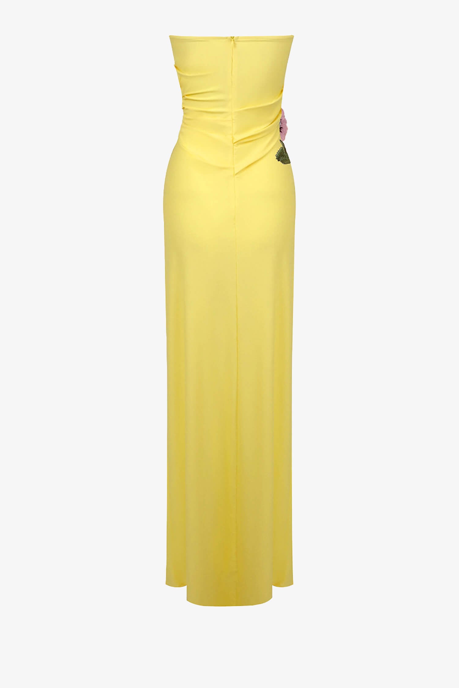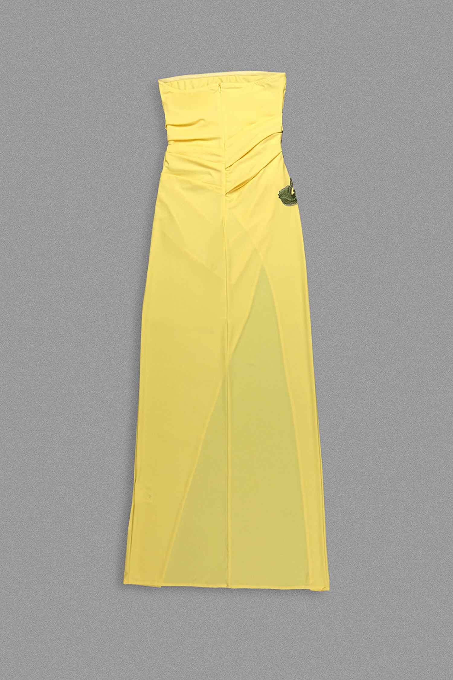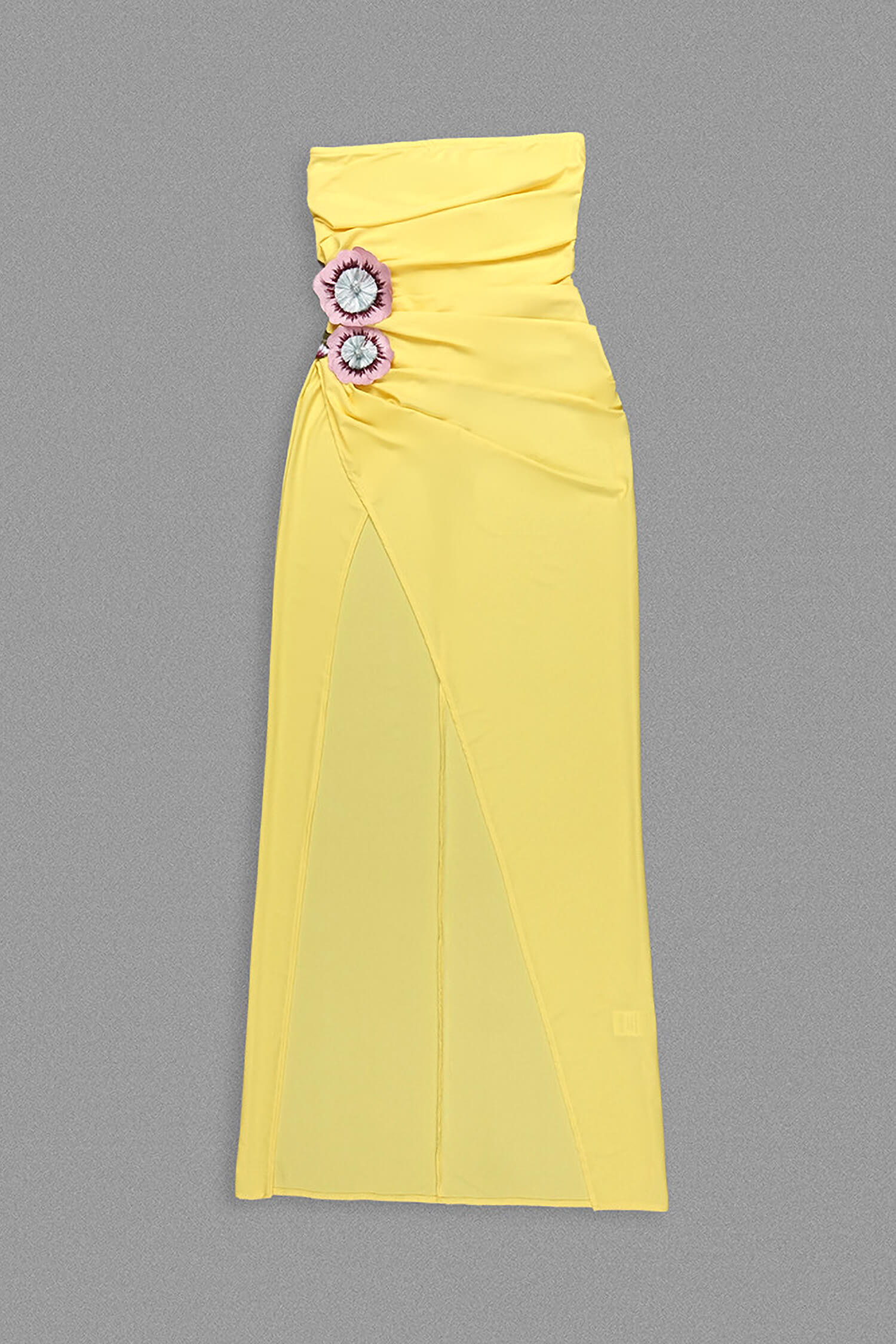 This Yellow Ruched Strapless Maxi Dress with Slit is a showstopper for women who love elegance and style. The strapless and sleeveless design creates a sleek and flattering neckline, while the ruched detailing enhances its sophisticated look. Crafted with a wrap-style silhouette and a dramatic slit, this dress combines femininity with allure. The addition of 3D floral appliques gives it a unique and charming detail, perfect for special events. Designed with stretchy fabric for comfort, this bodycon maxi dress is ideal for cocktail parties, prom nights, or walking the red carpet. With a secure zipper closure, it’s versatile for all seasons—summer, spring, fall, and winter.